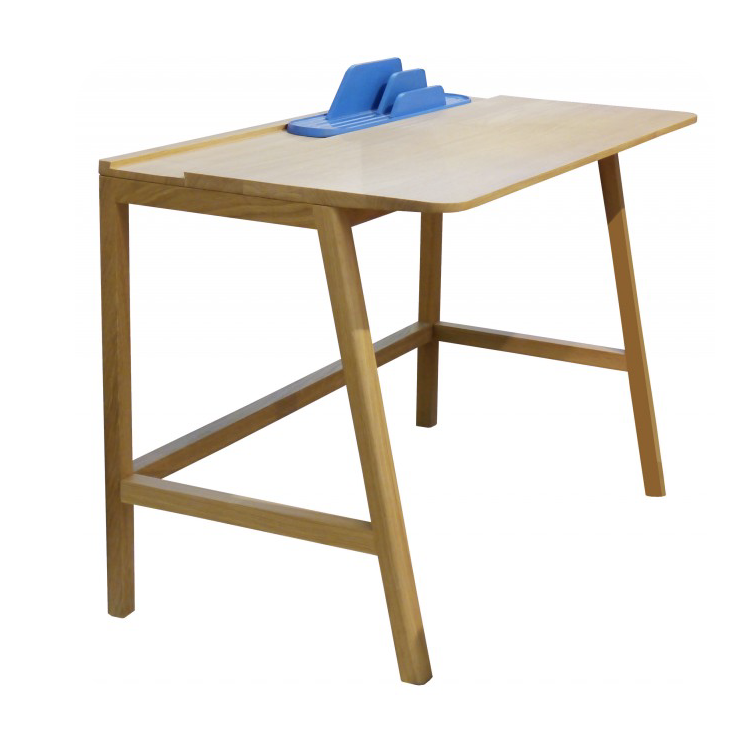 The oak VESSEL desk is finished with natural varnish and equipped with a document holder.