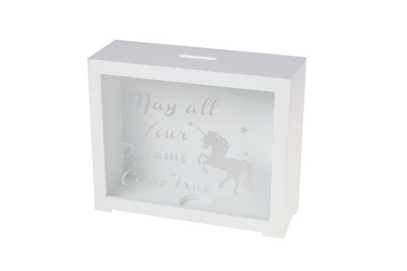 MONEY BOX SQUARE WOOD with unicorn and inscription "may all your dreams come true"