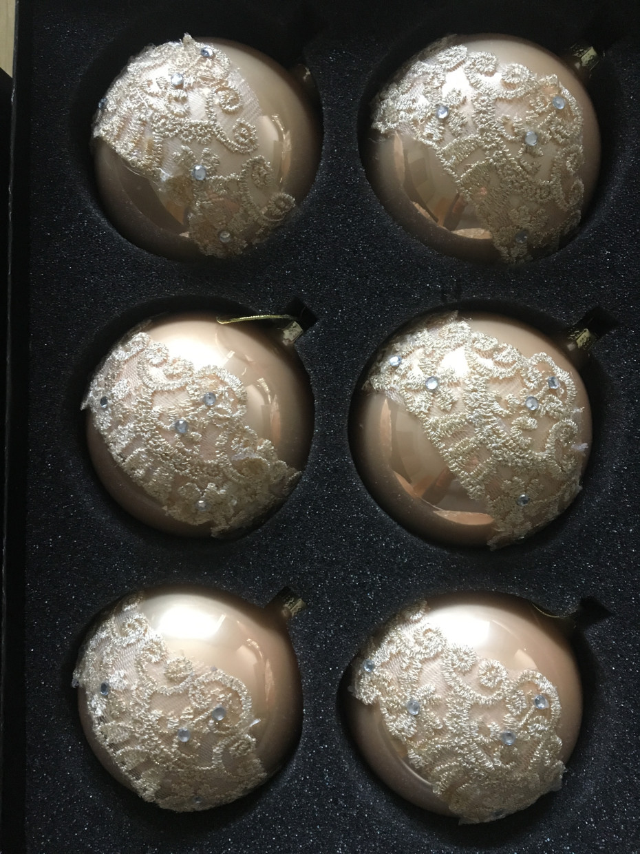 Box of 6 glass Christmas baubles gold with lace XMAS / NOEL