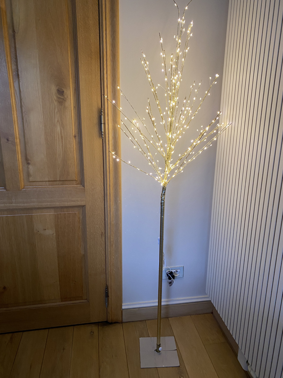 The gold-colored bare trees with LED lighting are made of metal and suitable for outdoor use. They have a cable length of 5m