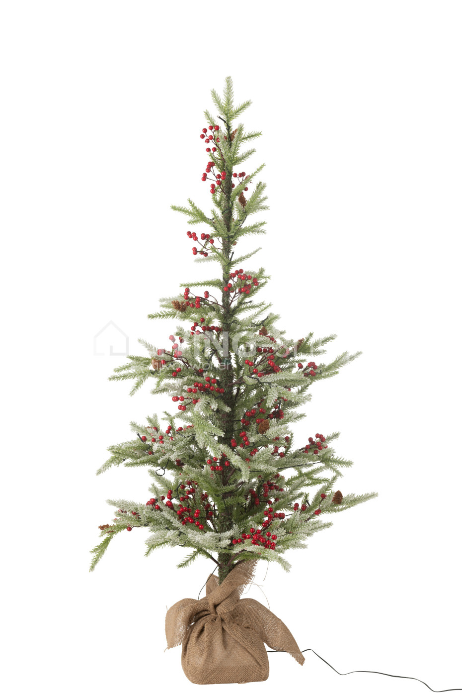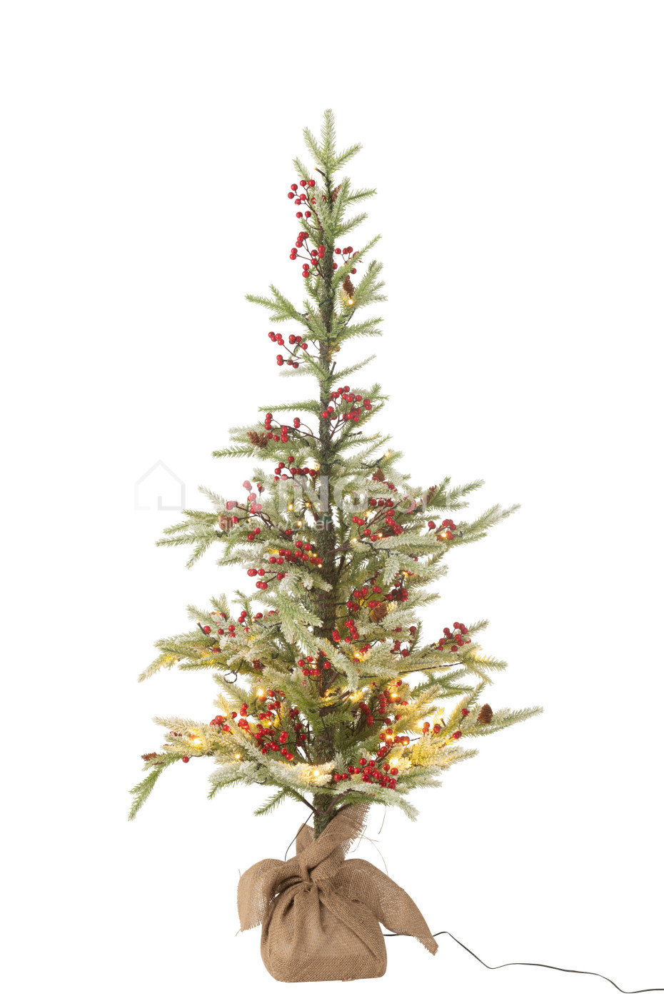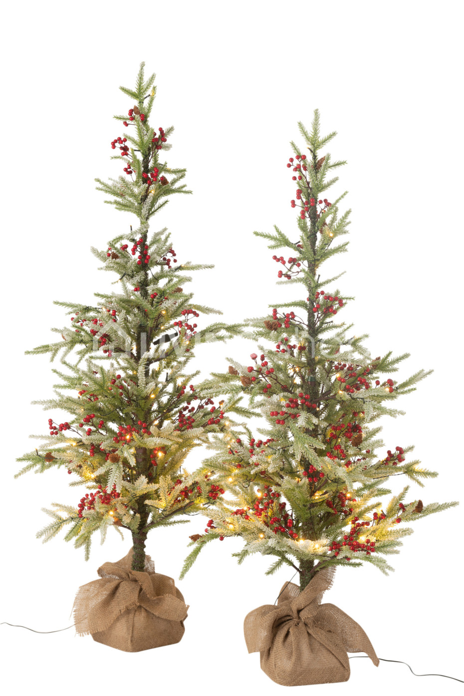 The J-Line plastic Christmas trees with LED lights, red berries, and artificial snow, with base in a jute bag, are available in two sizes:
