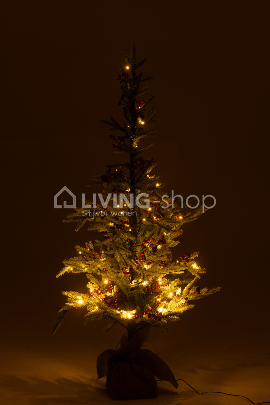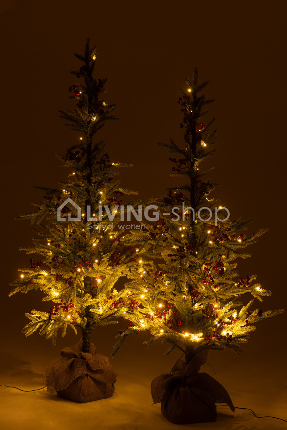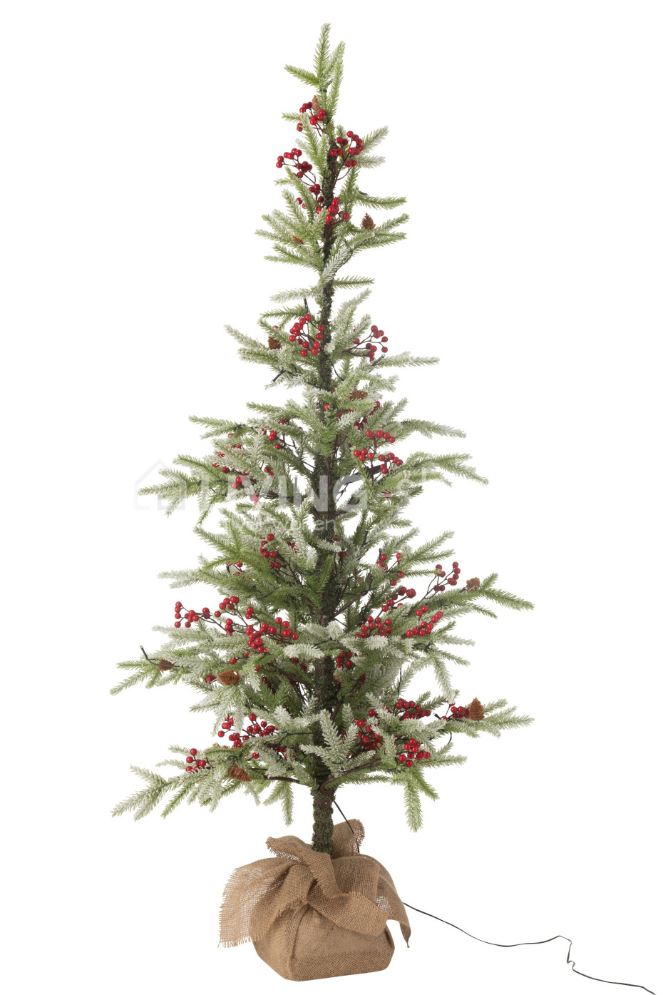 The J-Line plastic Christmas trees with LED lights, red berries, and artificial snow, with base in a jute bag, are available in two sizes: