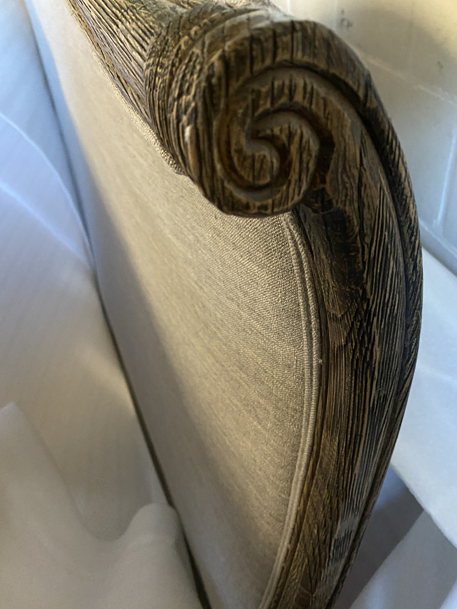 Rustic bed LOUIS XV in gray oak with linen headboard
