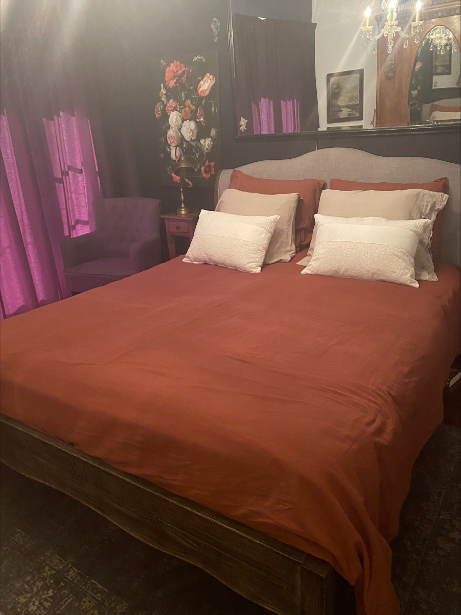 Beautiful oak country style bed with linen headboard and without footboard