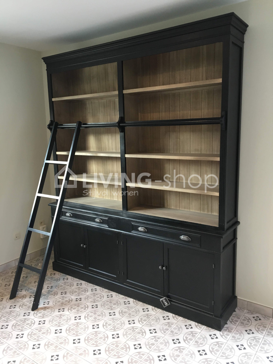 This black bookcase comes in 2 parts (upper part with shelves and low part with doors) which are mounted horizontally and the seperate ladder