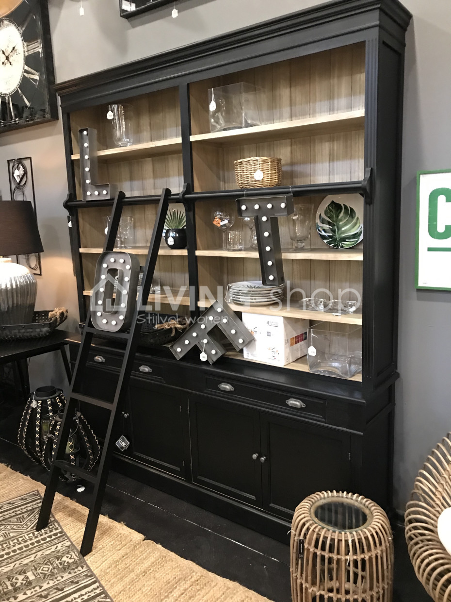 J-line Bookcase has a bookshelf with 5 shelves in the upper part library cabinet and dresser at the bottom with 2 drawers and 2 double cabinets with 4 doors. Practical library cupboard with ladder and black metal bar. J-line library cabinet made of wood and painted black.