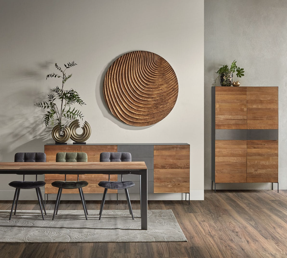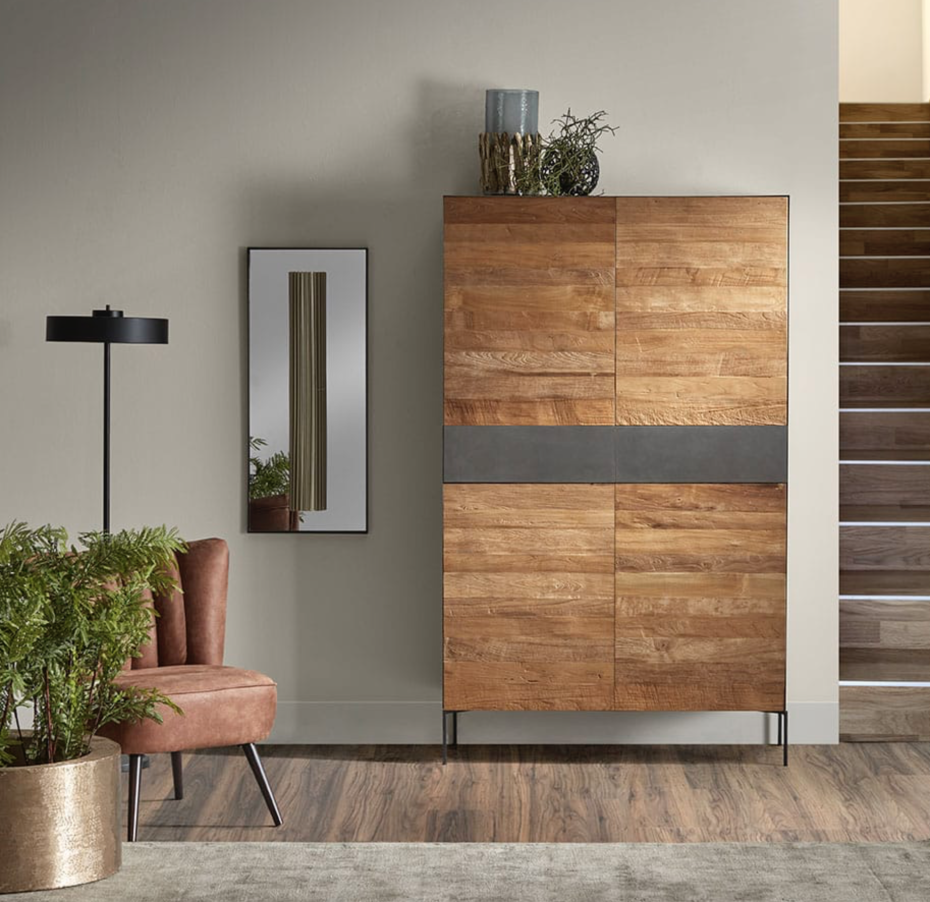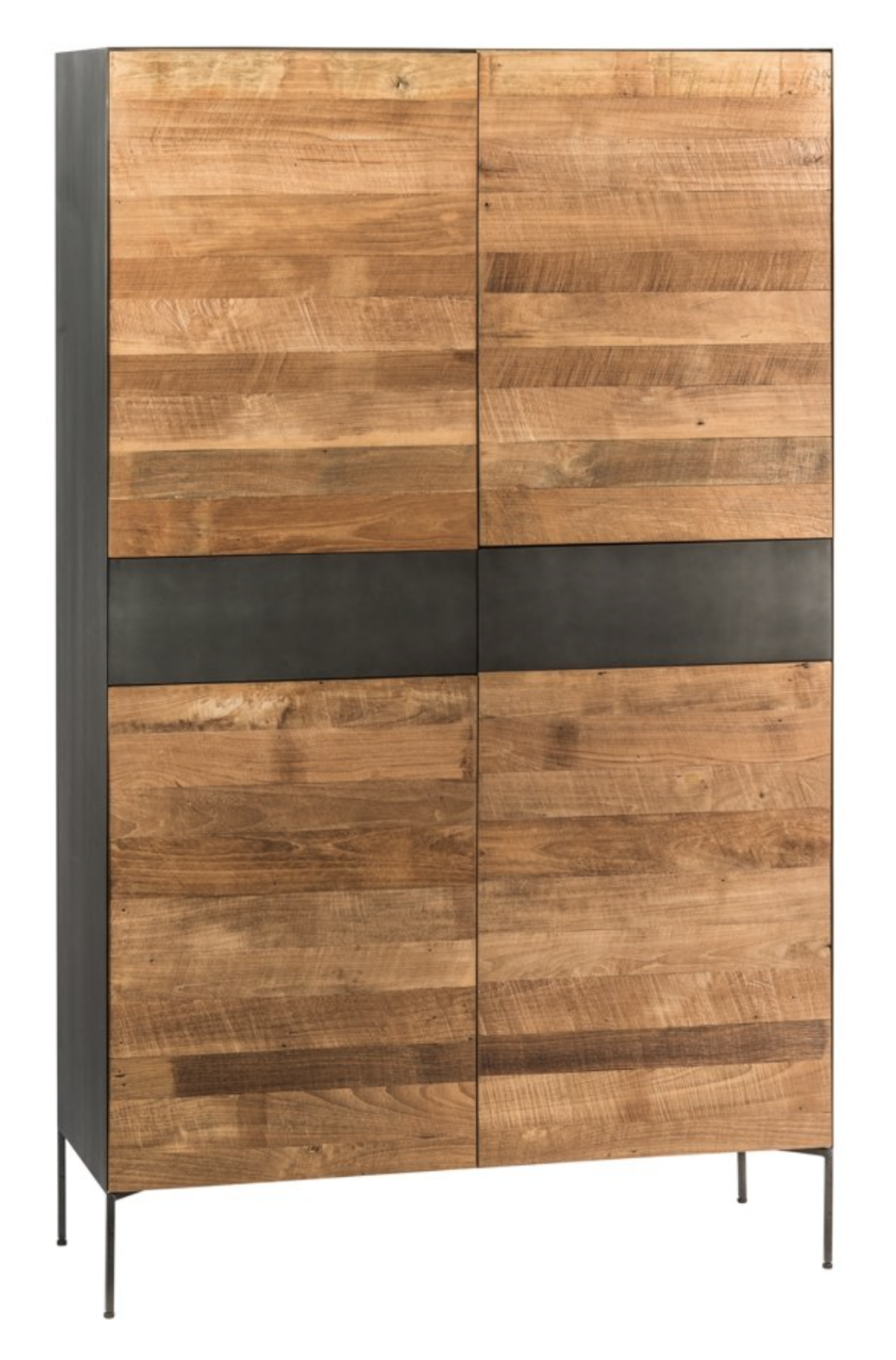 This cupboard is made of natural teak wood and the drawers and frame are metal black.