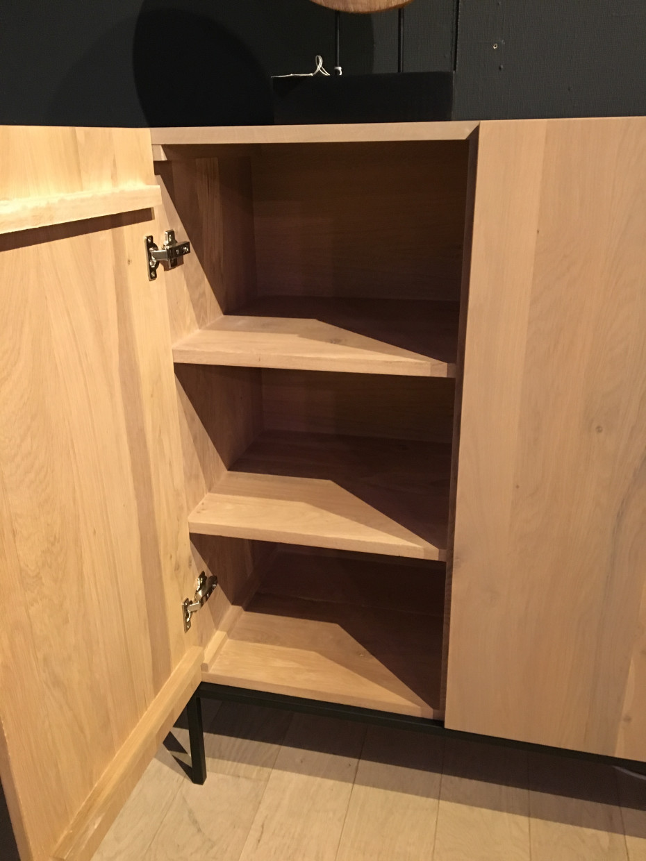 This sleek modern design oak buffet cabinet is made of almond natural oak, but is also available in gray oak heritage or black oak combined with black metal or gold iron frame (see last photos).