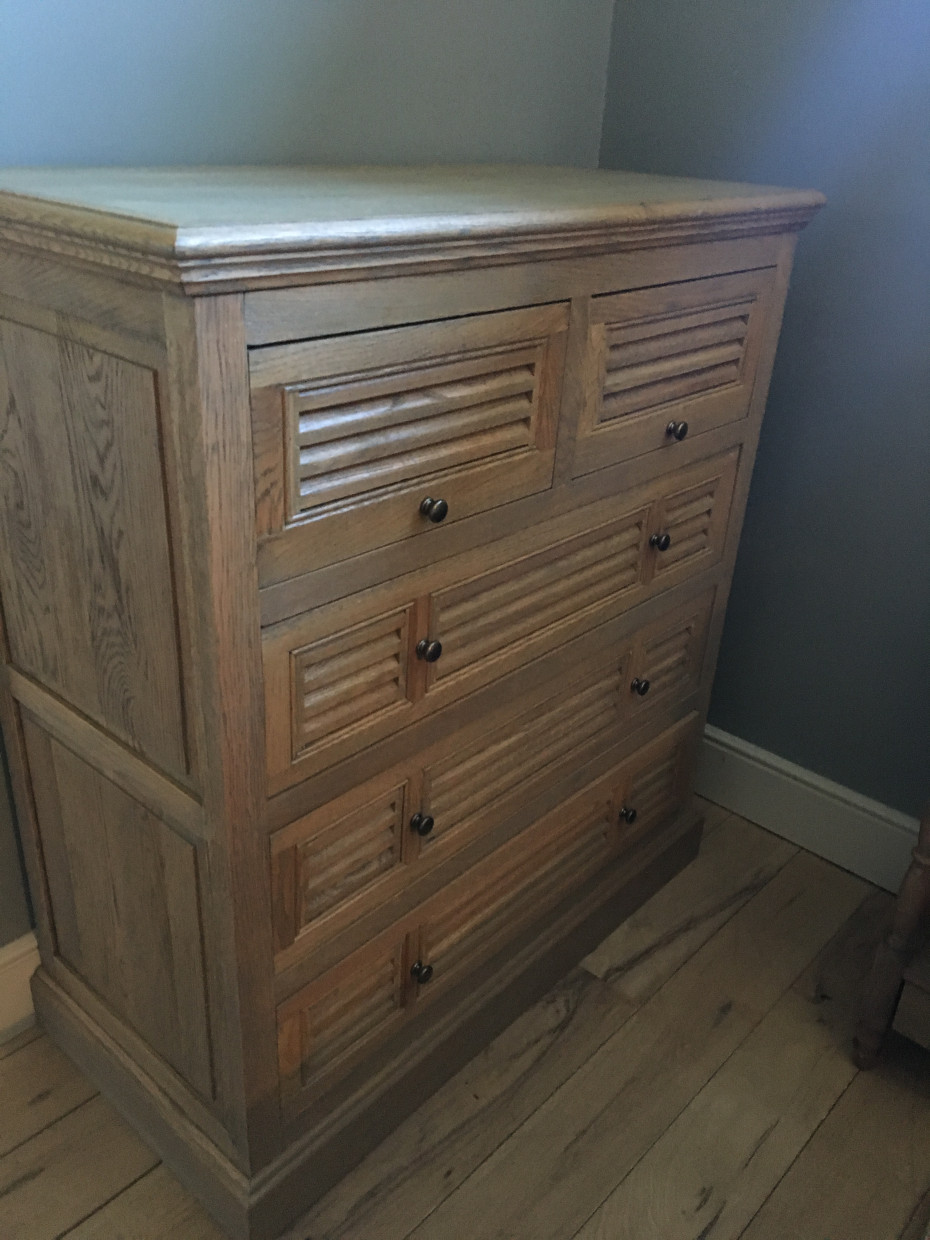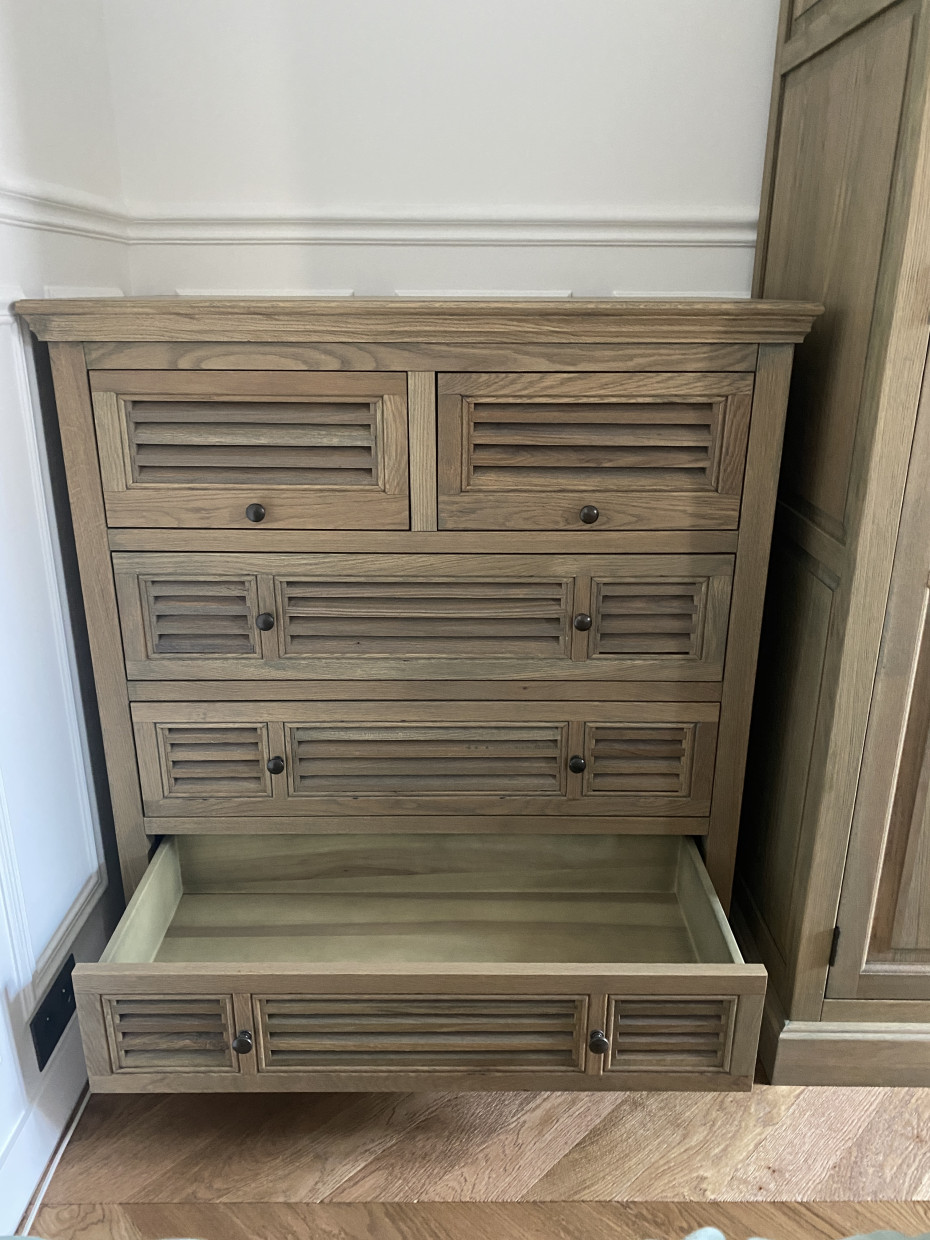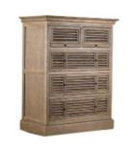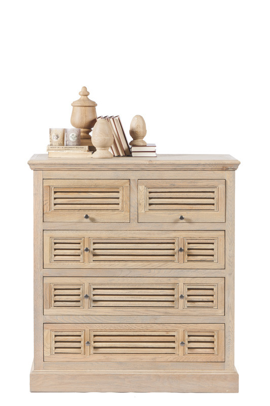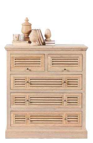 Louvre commode weathered oak with 5 drawers in country style. This classic oak commode has two drawers above and below 3 drawers over the entire width of the oak commode. The louvre drawers with brass handles give it a classic look to fit your elegant bedroom or charming hallway. Details, color and the aging process create a piece of funriture of exceptional beauty. dim L100XW48XH110CM Material 100% oak, weathered oak Color: Natural with gray patina finish Classic oak furniture, chests of drawers perfect for a room to sober and elegant style. On order, delivery time ± 2 weeks Find inspiration to furnish your home in a chic country style with this oak wooden commode.