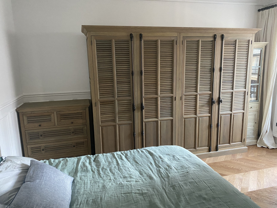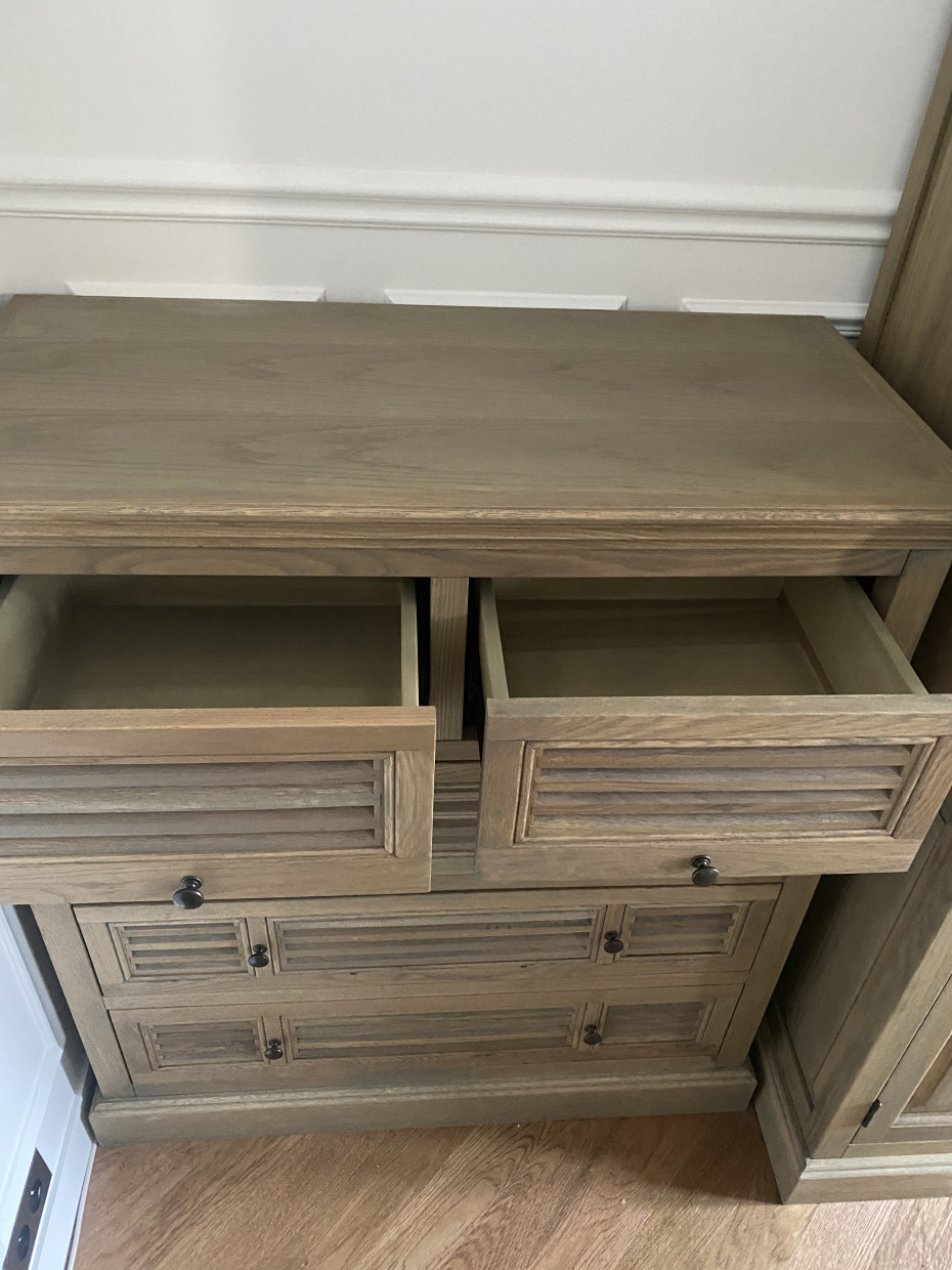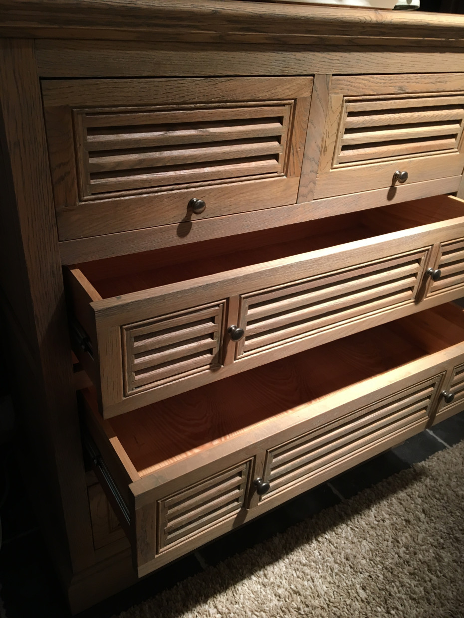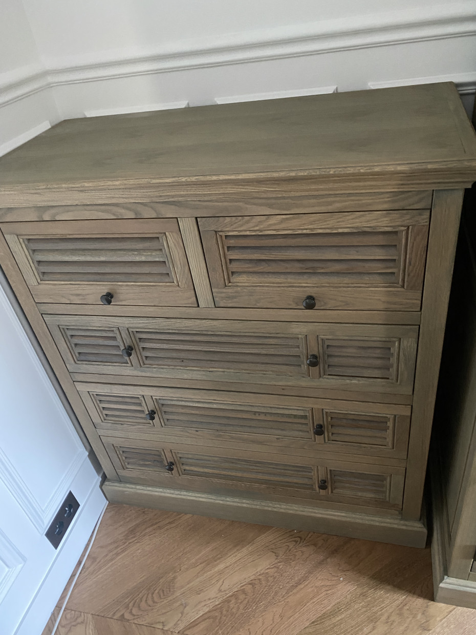 Louvre commode weathered oak with 5 drawers in country style. This classic oak commode has two drawers above and below 3 drawers over the entire width of the oak commode. The louvre drawers with brass handles give it a classic look to fit your elegant bedroom or charming hallway. Details, color and the aging process create a piece of funriture of exceptional beauty. dim L100XW48XH110CM Material 100% oak, weathered oak Color: Natural with gray patina finish Classic oak furniture, chests of drawers perfect for a room to sober and elegant style. On order, delivery time ± 2 weeks Find inspiration to furnish your home in a chic country style with this oak wooden commode.