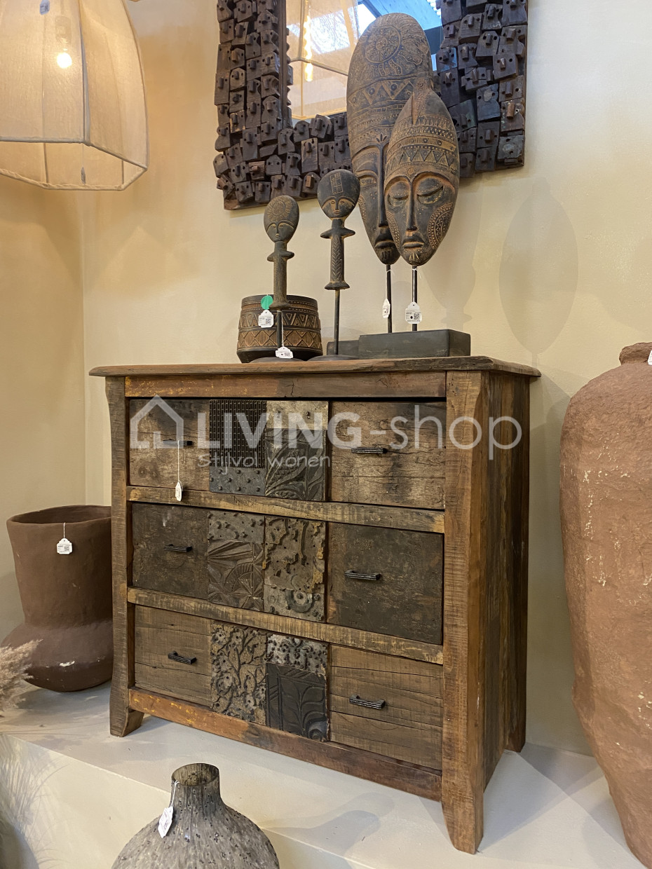 Country style chest of drawers with drawers made of sustainable recycled wood with a weathered look.