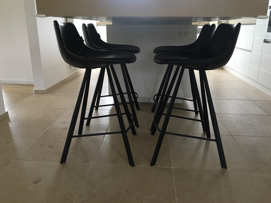 Counter chair Alicia is made with a pu seating with baseball stitching and with sturdy metal black legs.