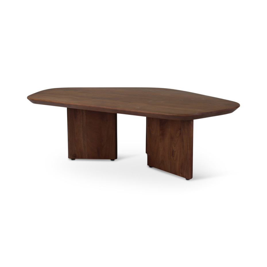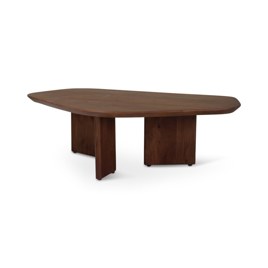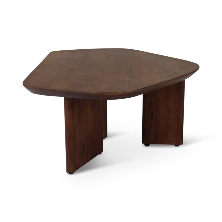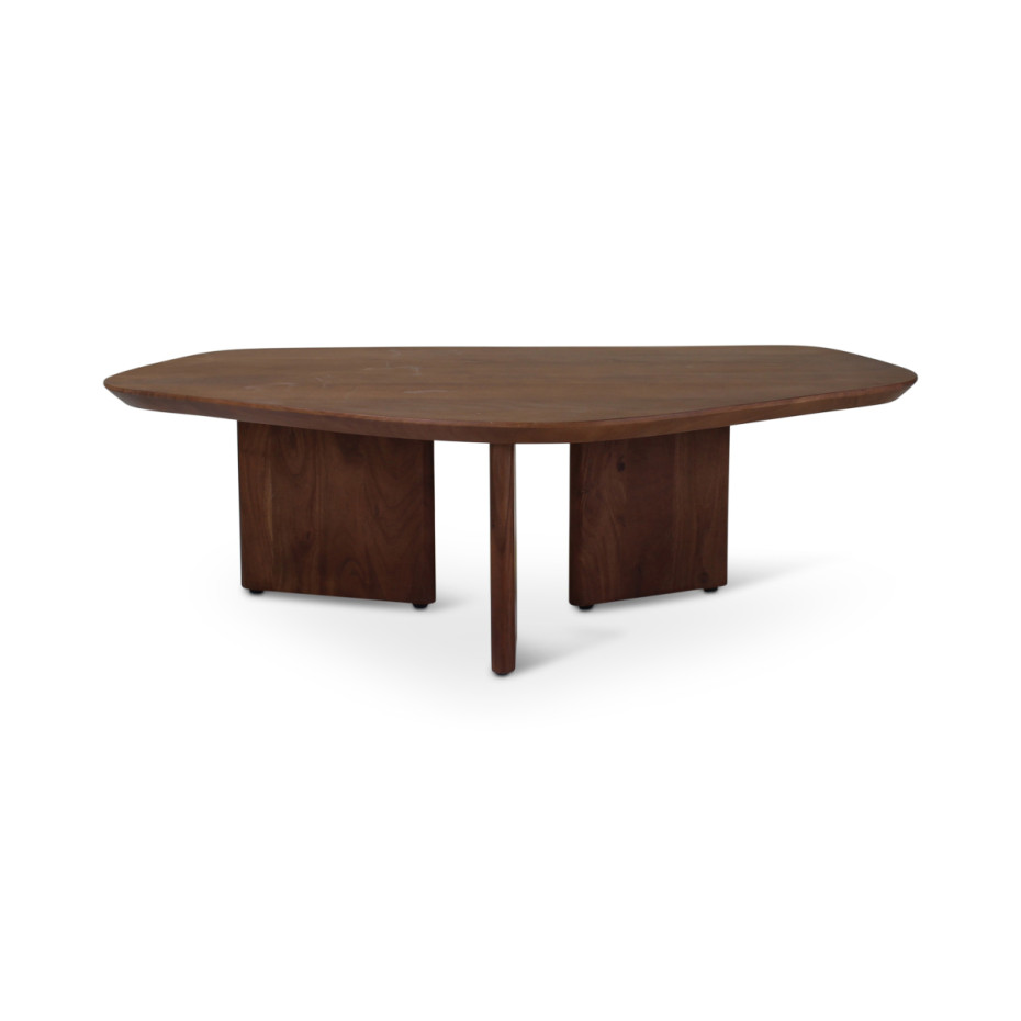The modern Kato coffee table in the shape of an organically rounded triangle is made entirely of acacia wood