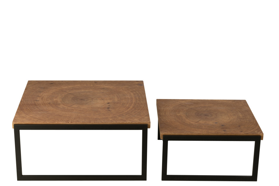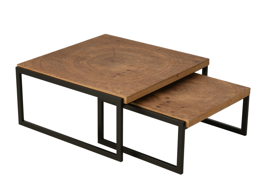 Set of 2 coffee tables with wooden top and black metal table leg.