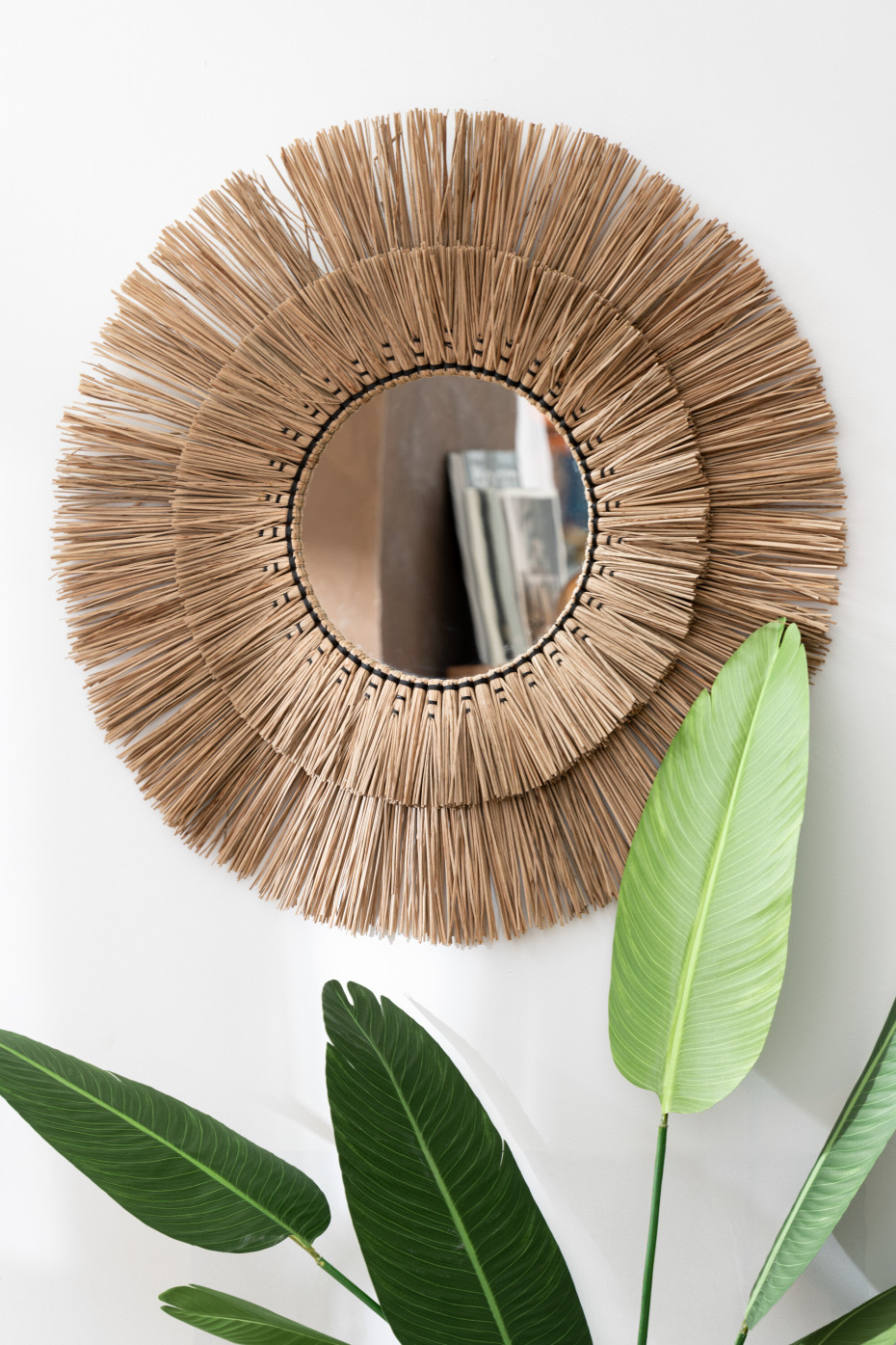 Give this round wall mirror decorated with grass raffia a special place in your home.