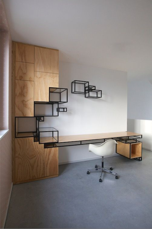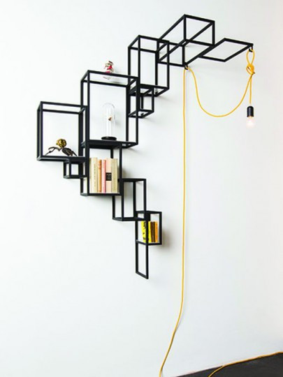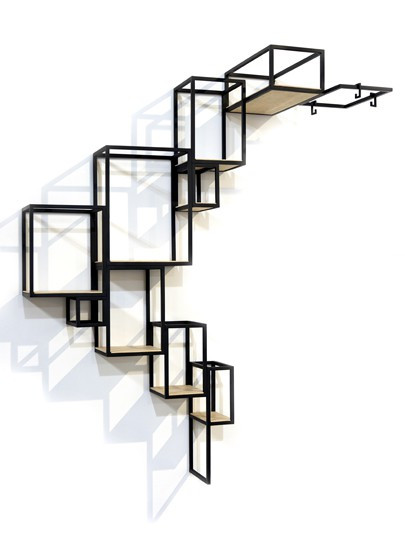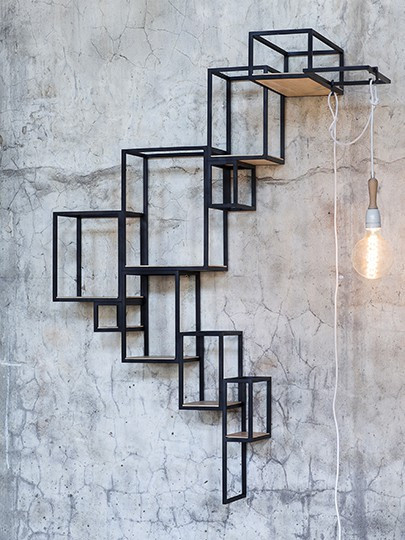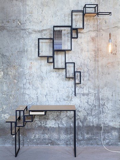 Jointed wall is a black iron wall frame constructed from various modules and combined with natural wood
