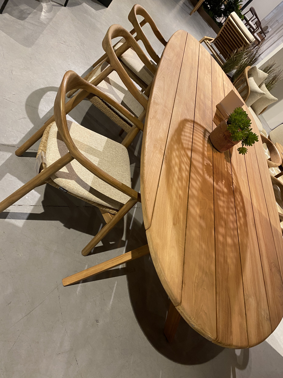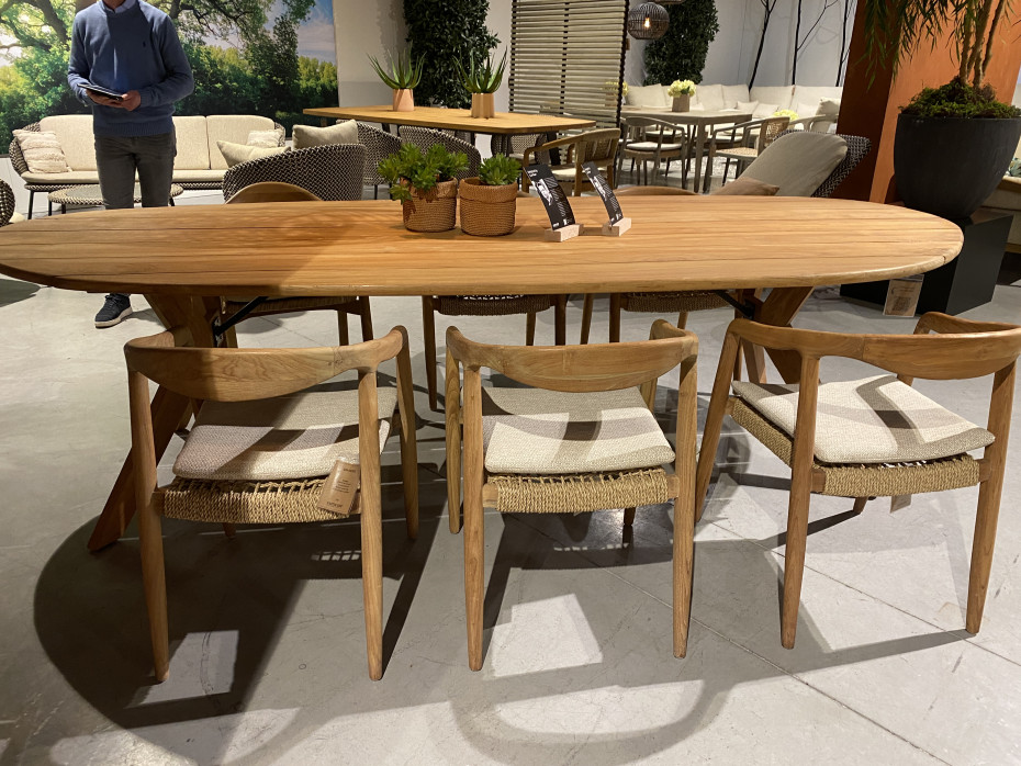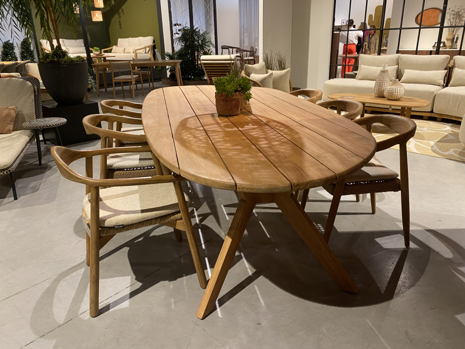 This organically designed oval teak dining table Castor has a sloping beveled edge