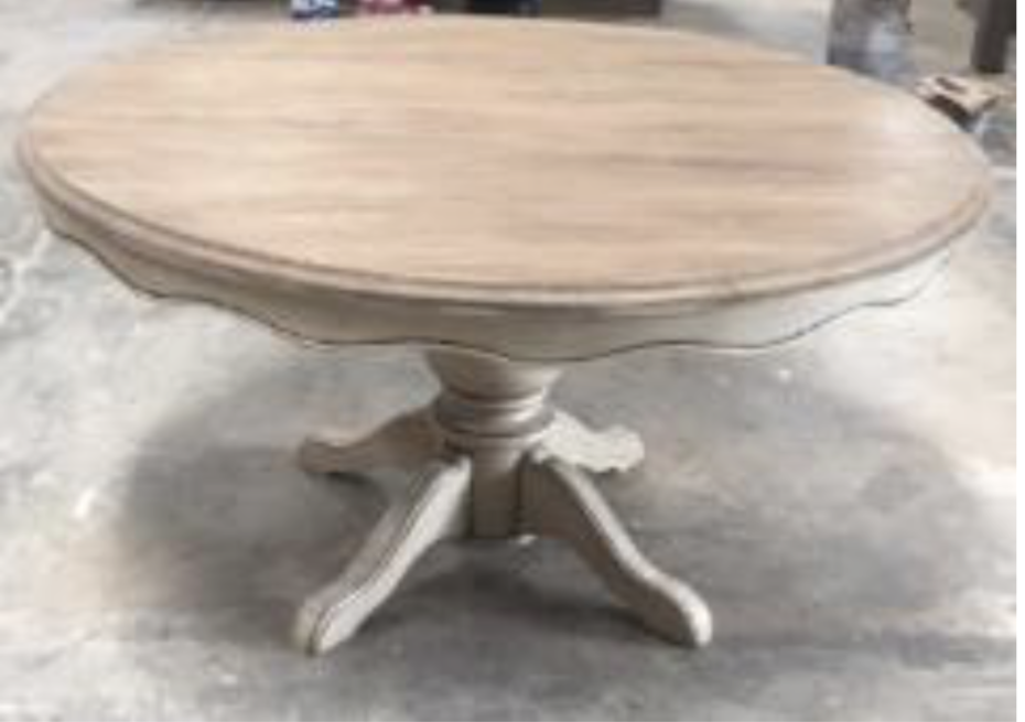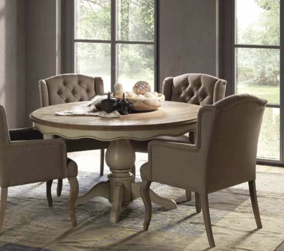 This round dining table is made of vieux cream with natural teak top which adds extra charm and an extra rural character to the dining table. This round model dining table offers seating for 6 to 8 guests.