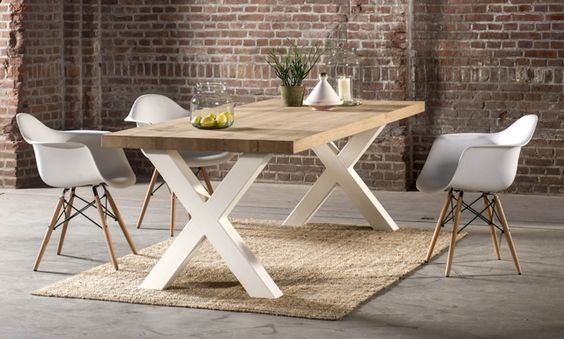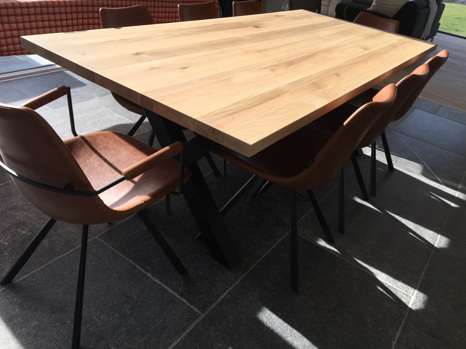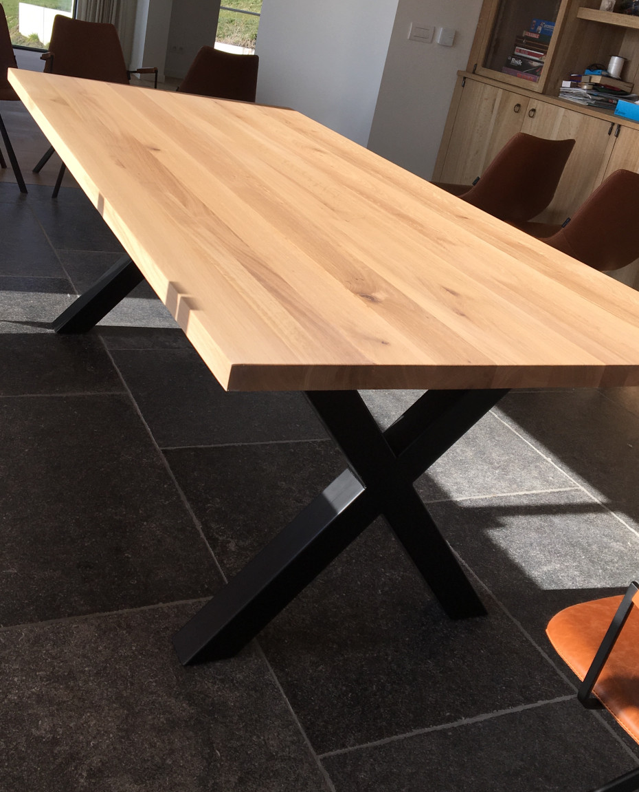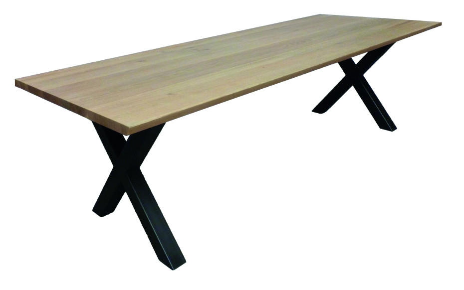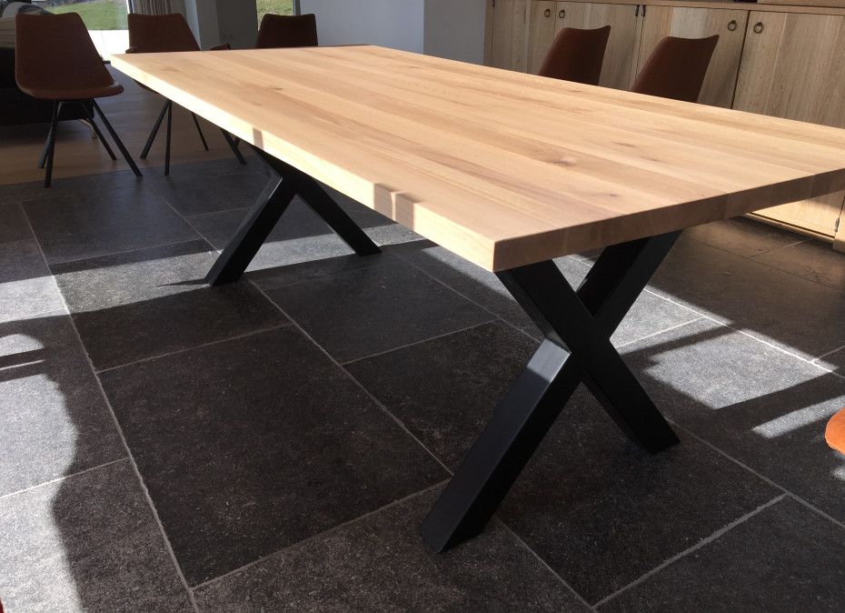 Robust oak table with X legs to choose in black metal or white metal with a thick oak table top of 4 cm