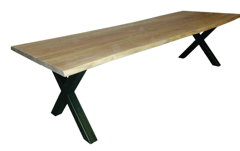 Oak dining table with X legs to choose with rectangular or oval tabletop. You can also choose the table edge of your tabletop, 3 choices: straight or rounded or trunk / tree trimming finish.