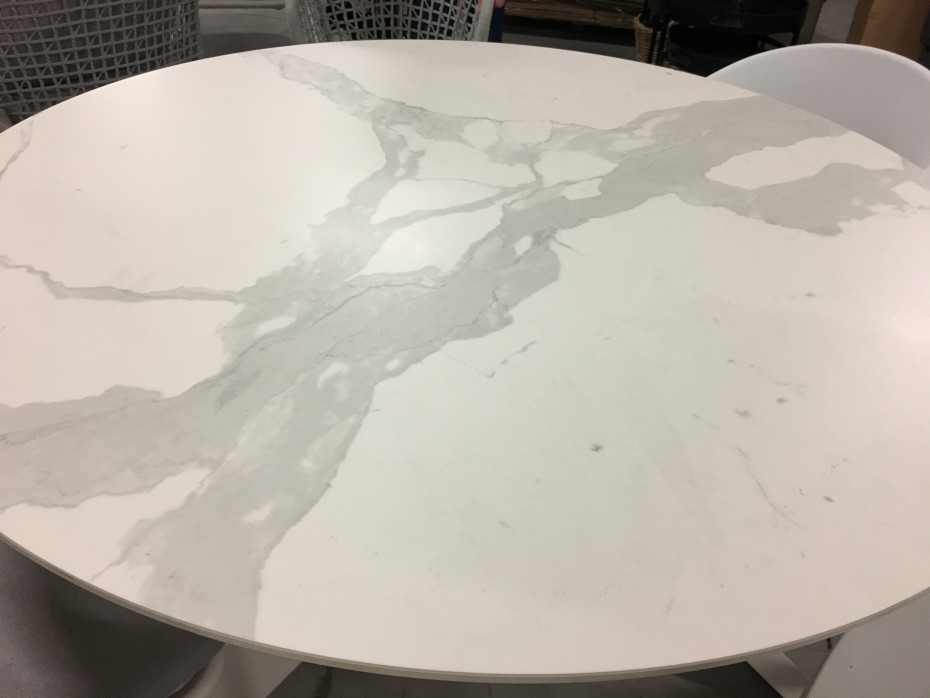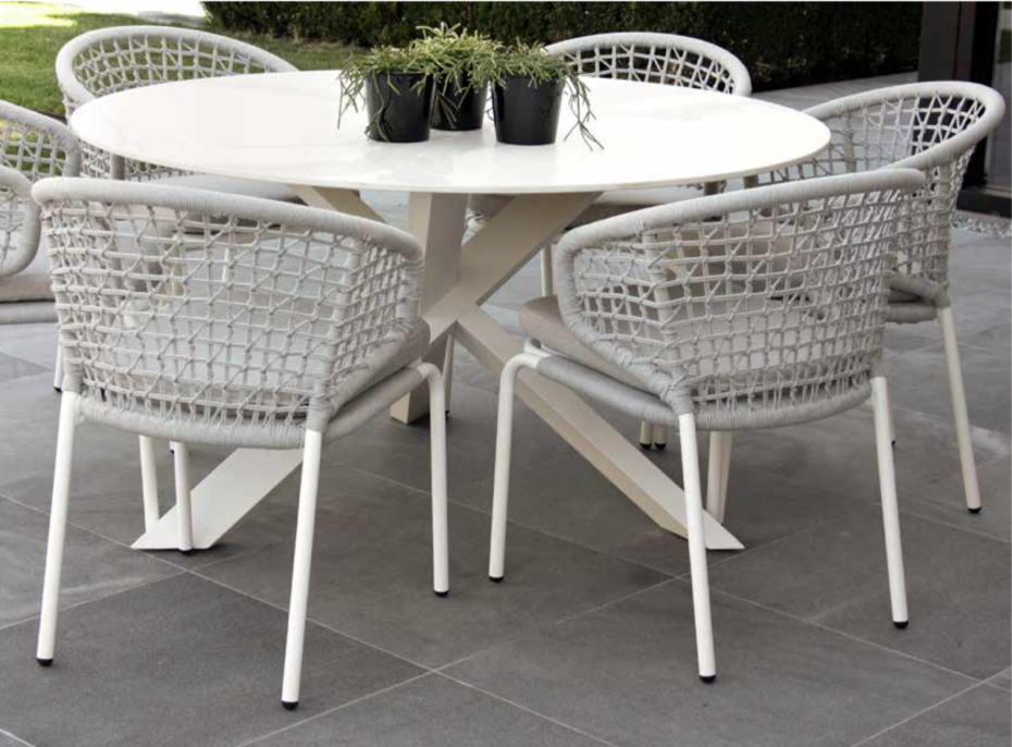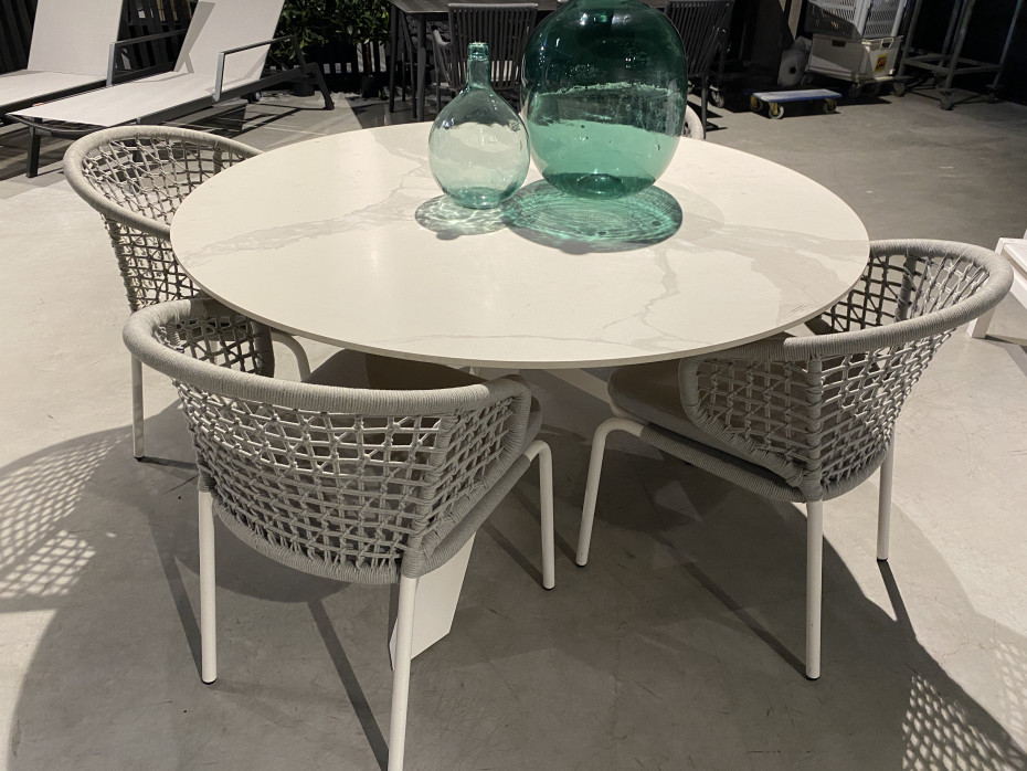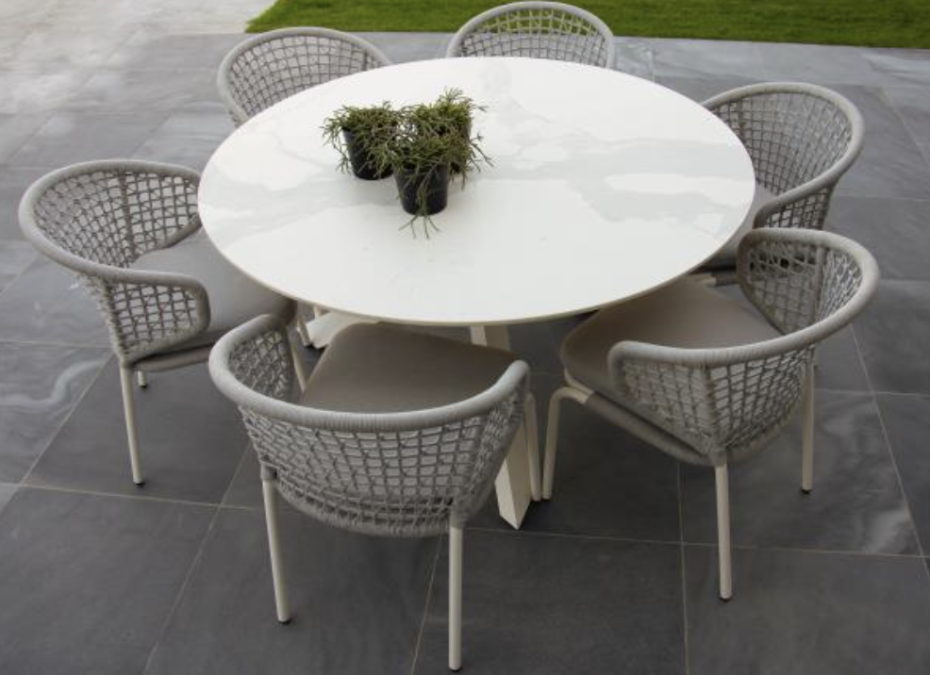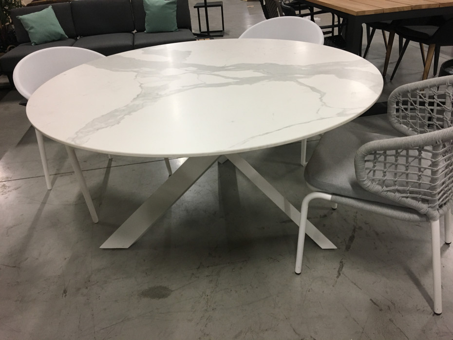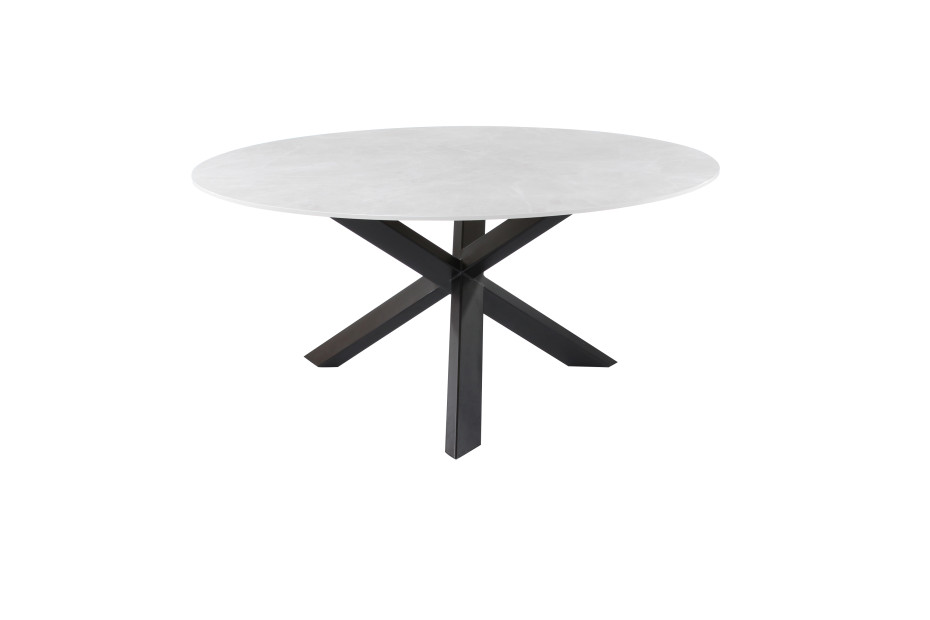 Round ceramic marble look dining table from Castle Line with crossed aluminium metal table base. Marble look Ceramic is ideal as a kitchen table given the ease of maintenance.