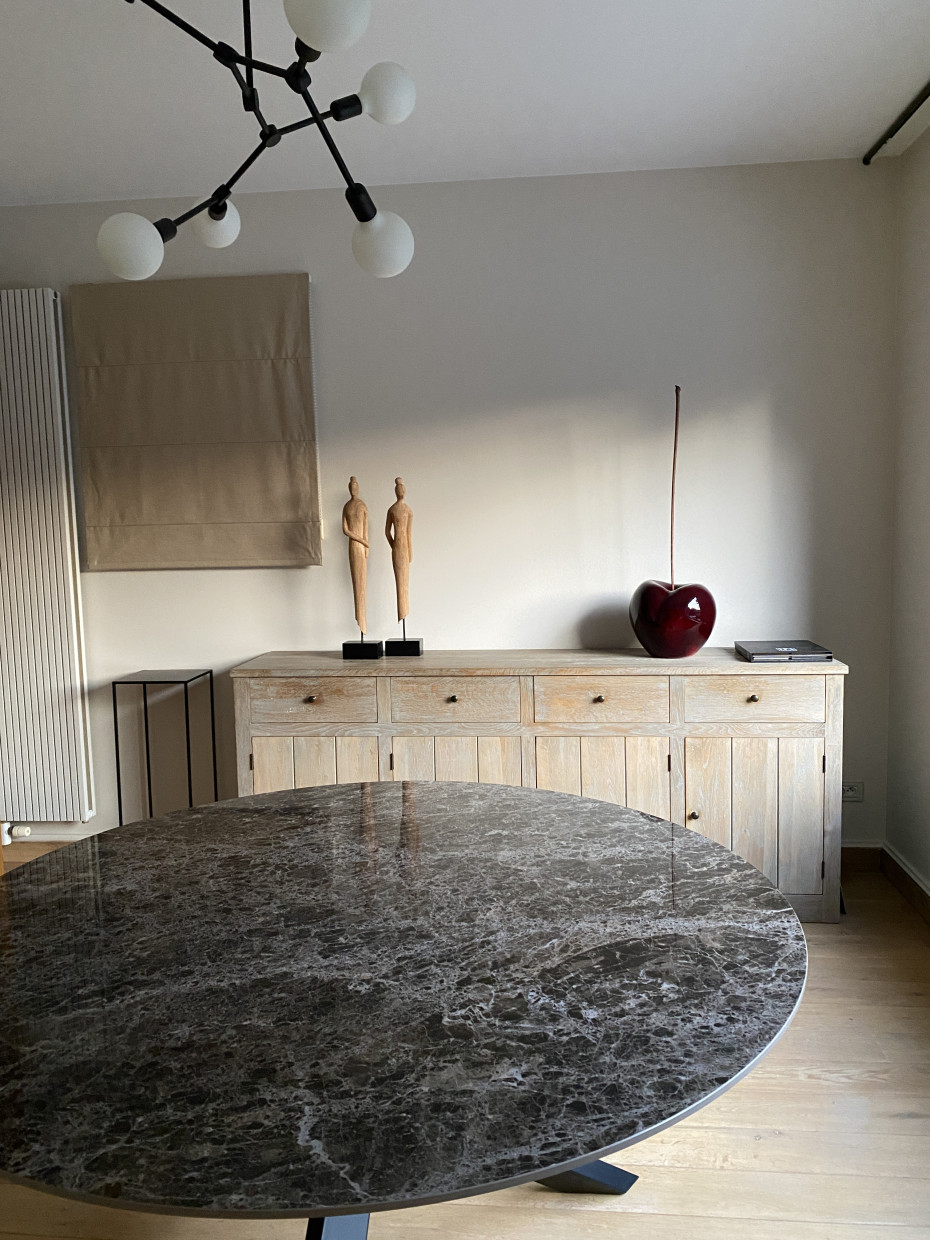 This ceramic table can be ordered in 4 diameters and is produced according to your choice of diameter, color leg and color ceramics (3 colors possible: black, grey/whiet or emperador).