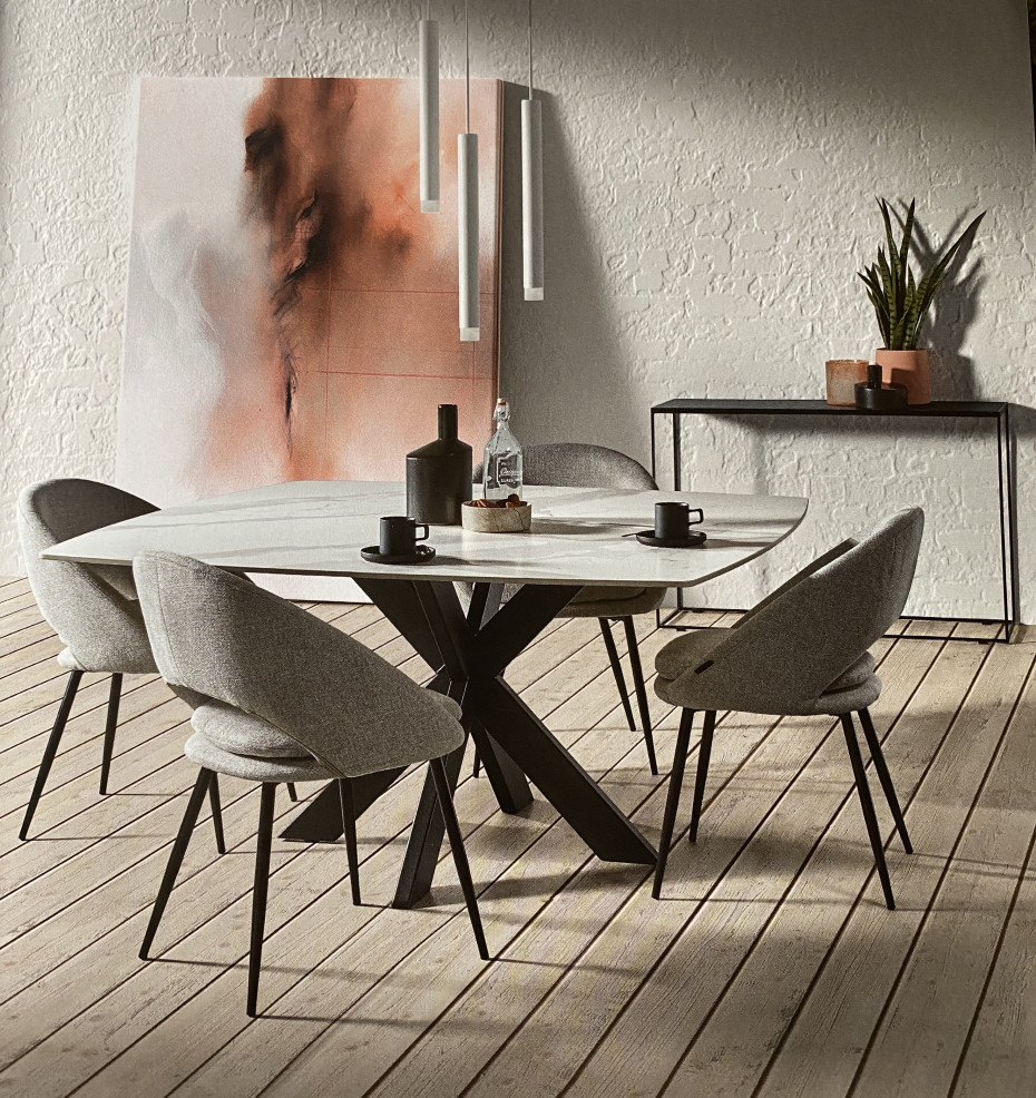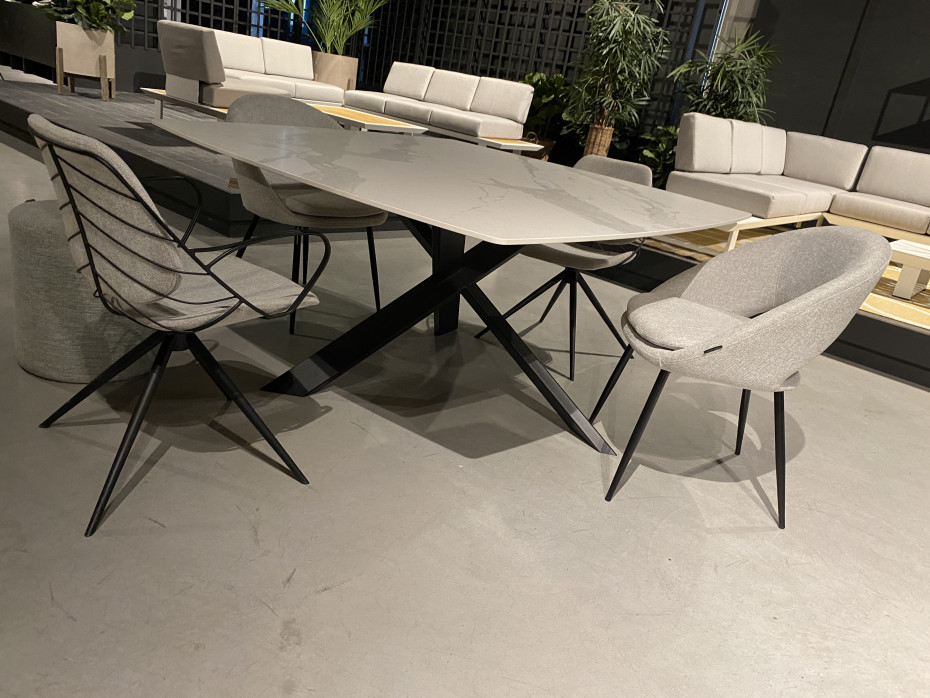 Dining table with ceramic top marble look gray white with iron table base in white ice or black anthracite