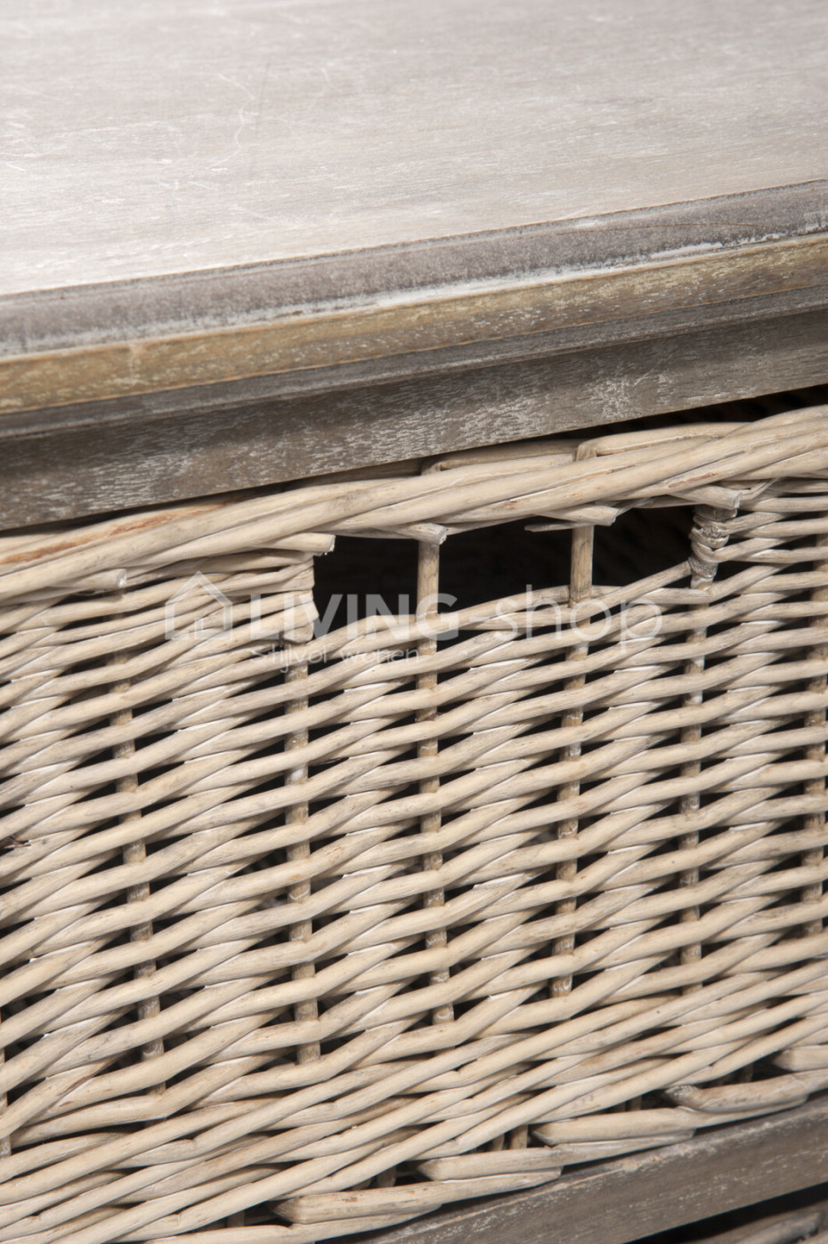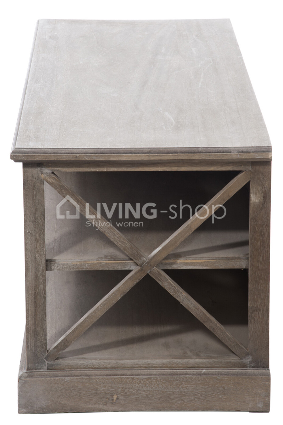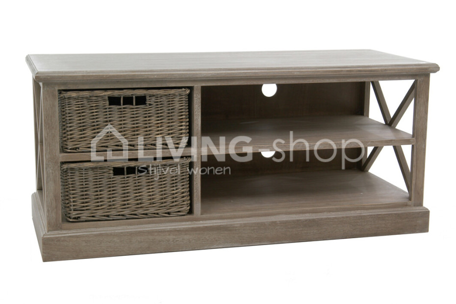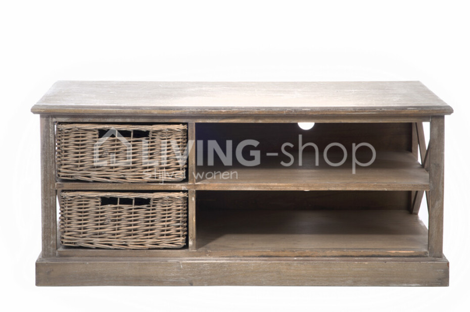 TV cabinets country style with 2 baskets and 2 shelves, in Paulownia wood with old grey coating. Dimensions: 120x49x51cm. Dim baskets: 36x30xH19CM