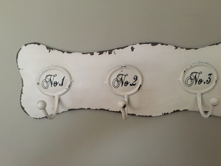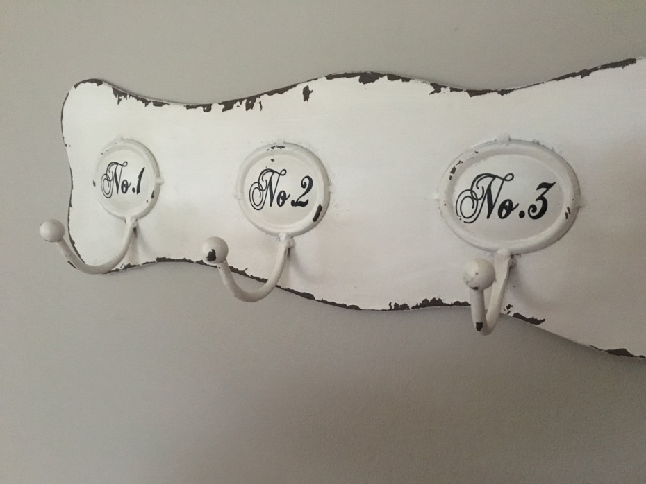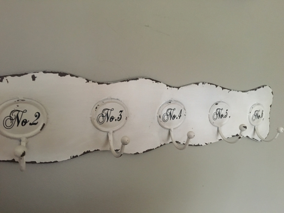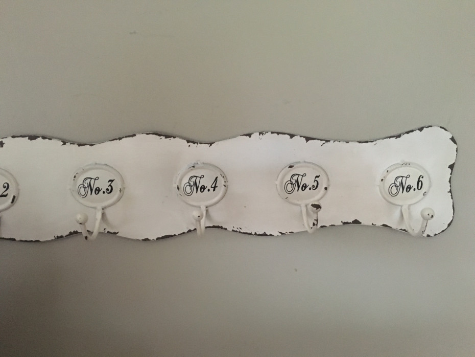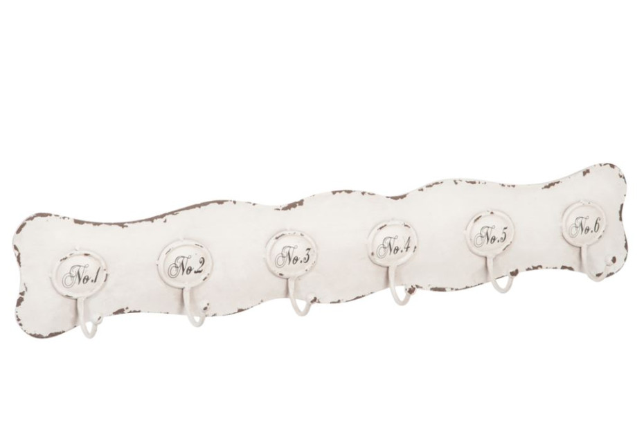 Numbered coat rack with 6 hooks made of metal.