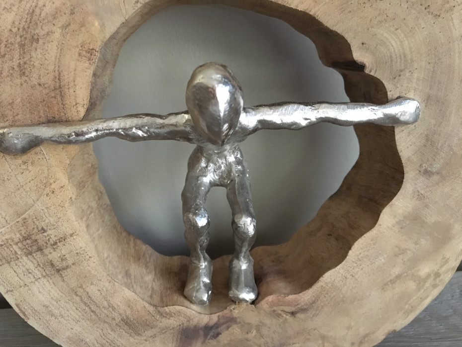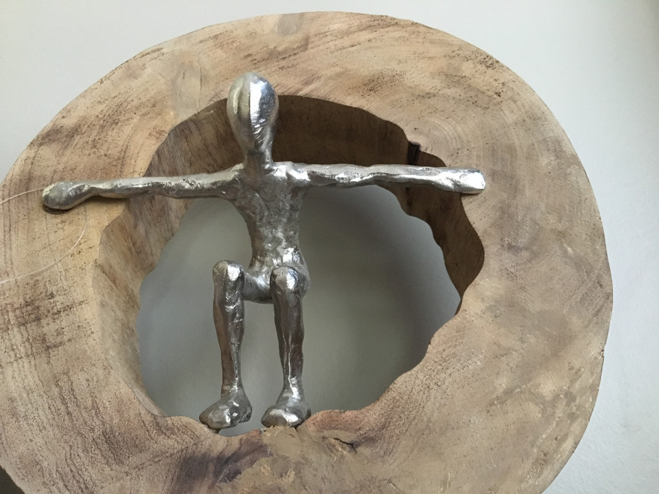 Decorative sculpture of a silver person jumping through the opening of the wooden tree trunk.