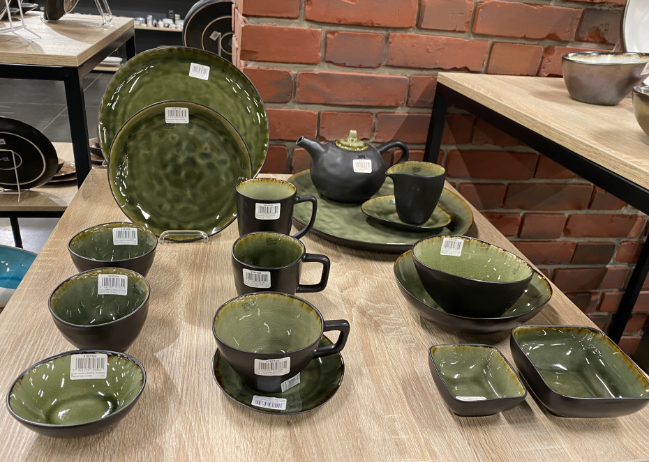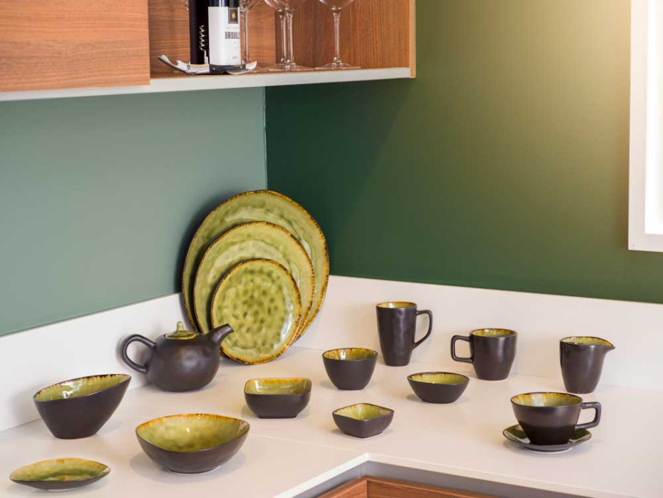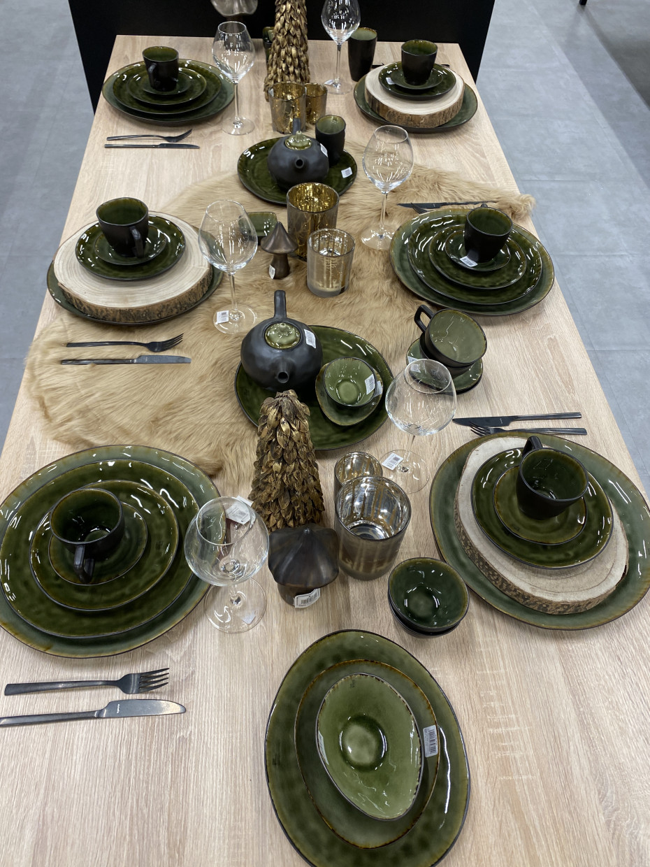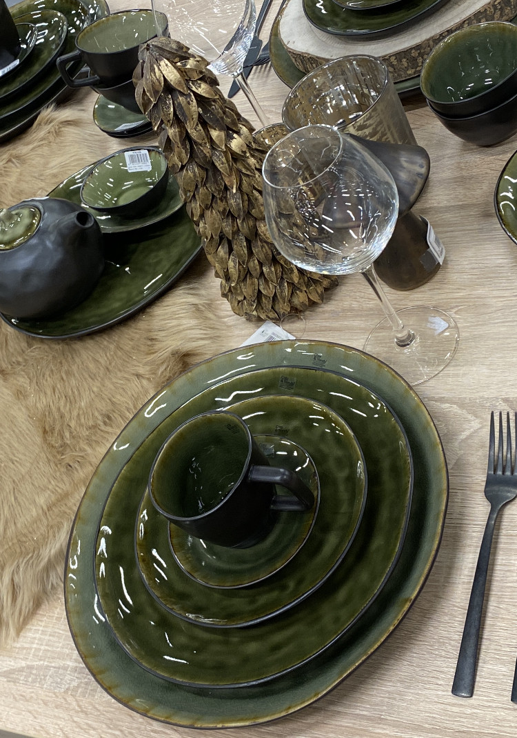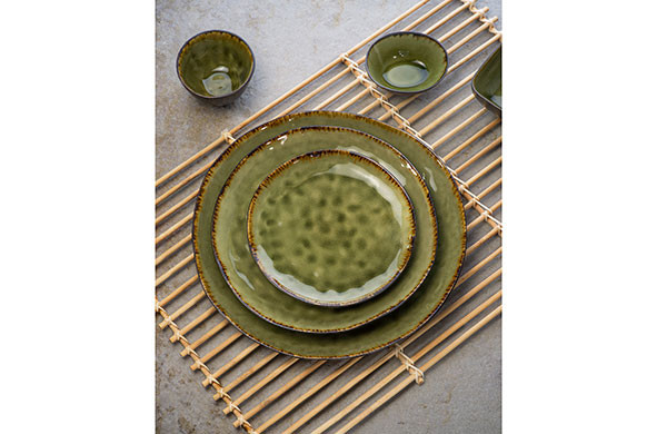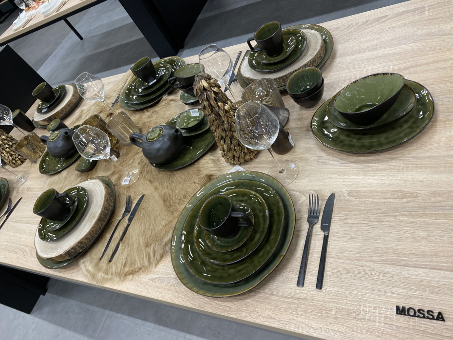 The Mossa table service from Cosy & Trendy has deep and soft shades of green, crackle, contrasting exterior, spicy edge and organic shape.