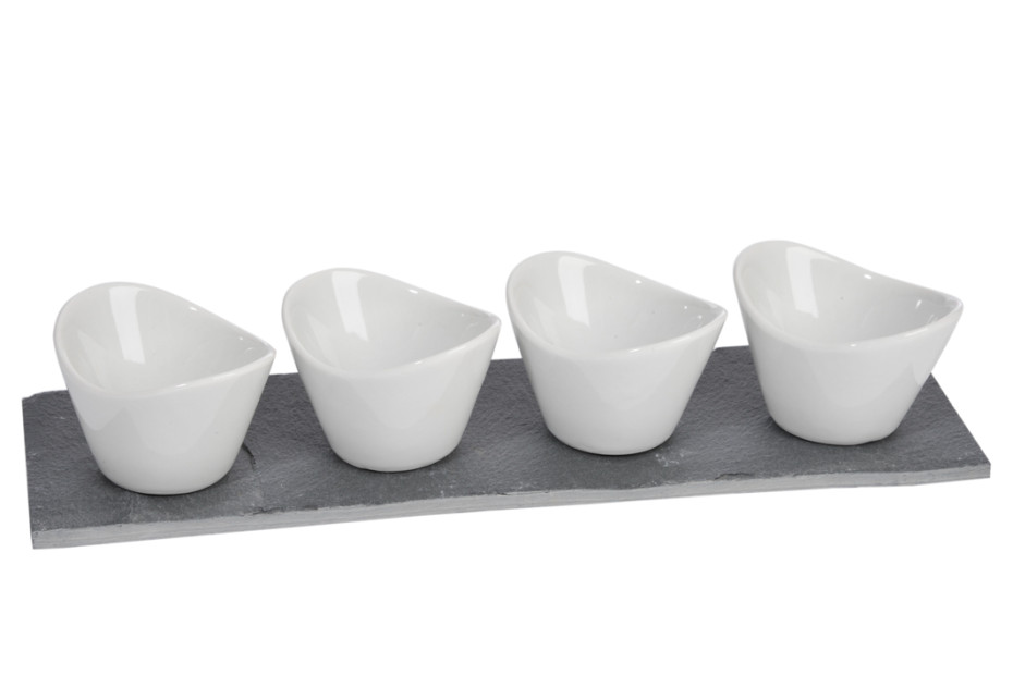 1 slate plate with 4 appetizer bowls in porcelain.