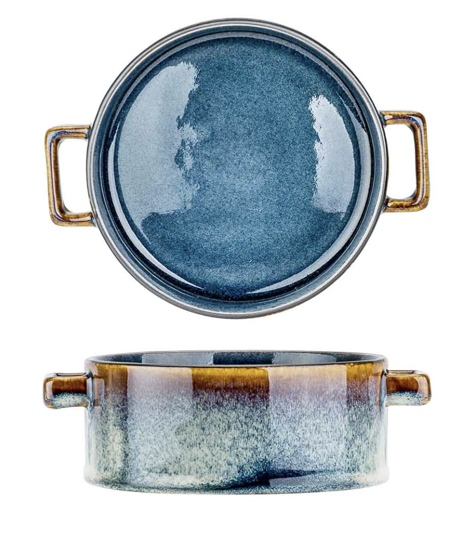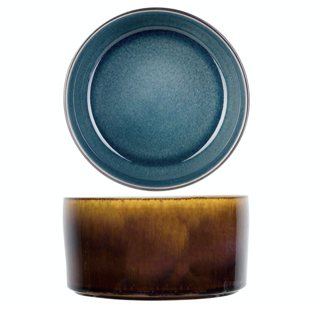 Quintana Blue is a tableware with a very simple shape with vertical edges. But what really impresses is the color brilliance. The beautiful blue of the inside is combined with trims with a gradient of intense amber and blue tones.