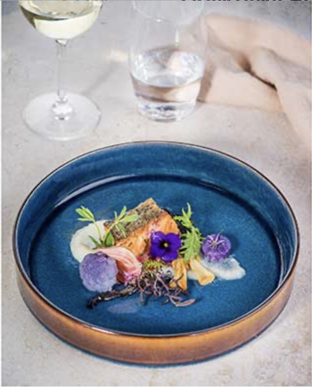 The Quintana Blue dinner plates are finished with afine brown plate edge, which provides a nice contrast.