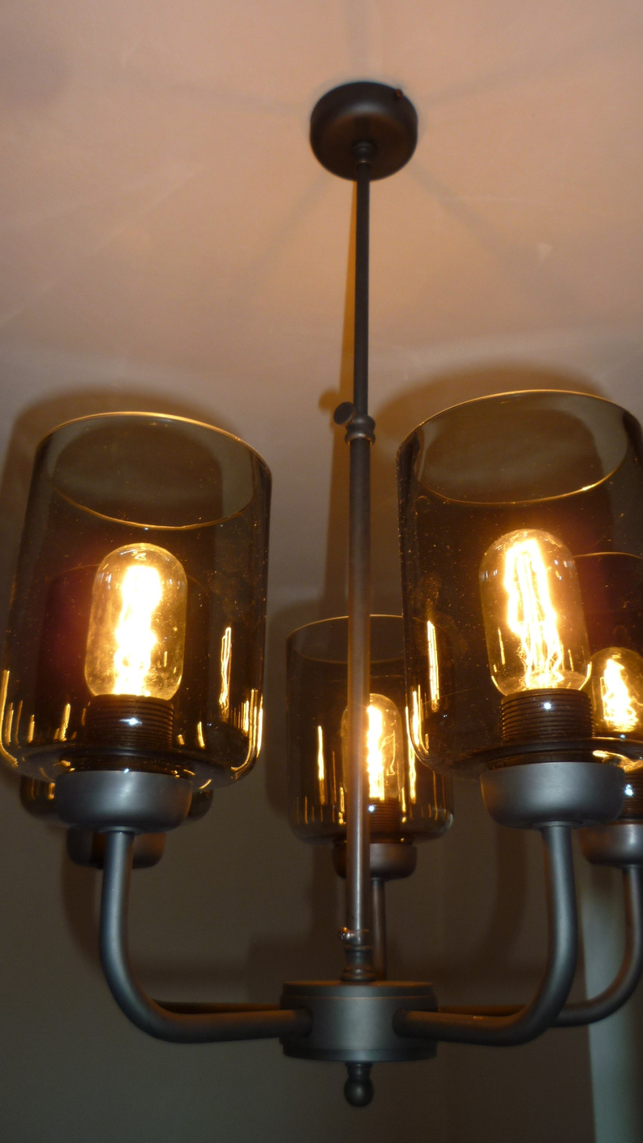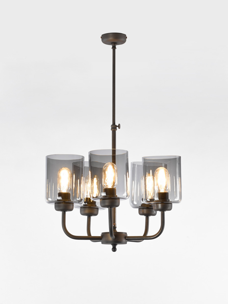 Luster loft stijl met 5 glazen lampenkappen, loft stijl woonkamer verlichting. Loft luster van brons met 5 armen en 5 cylinder glazen lampenkappen. De glazen lampenkappen zijn in 2 kleuren beschikbaar: helder transparant glas of fumé lichtgrijs glazen lampenkappen. Afm luster Ø 40CM, pavjoen Ø 9CM