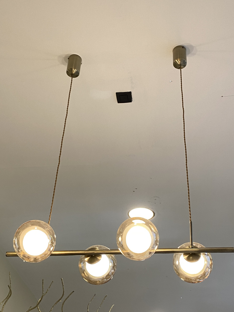 J-Line luster Yuks hanging lamp with 4 light points. This modern design luster Yuks hanging lamp is a gold steel hanging lamp where you can choose from 2 colors of glass lampshades (not included and can be selected separately)