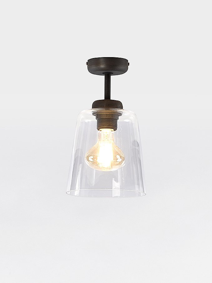 Loft style ceiling lamp in dark bronze or dark rust finish with glass lampshade included.