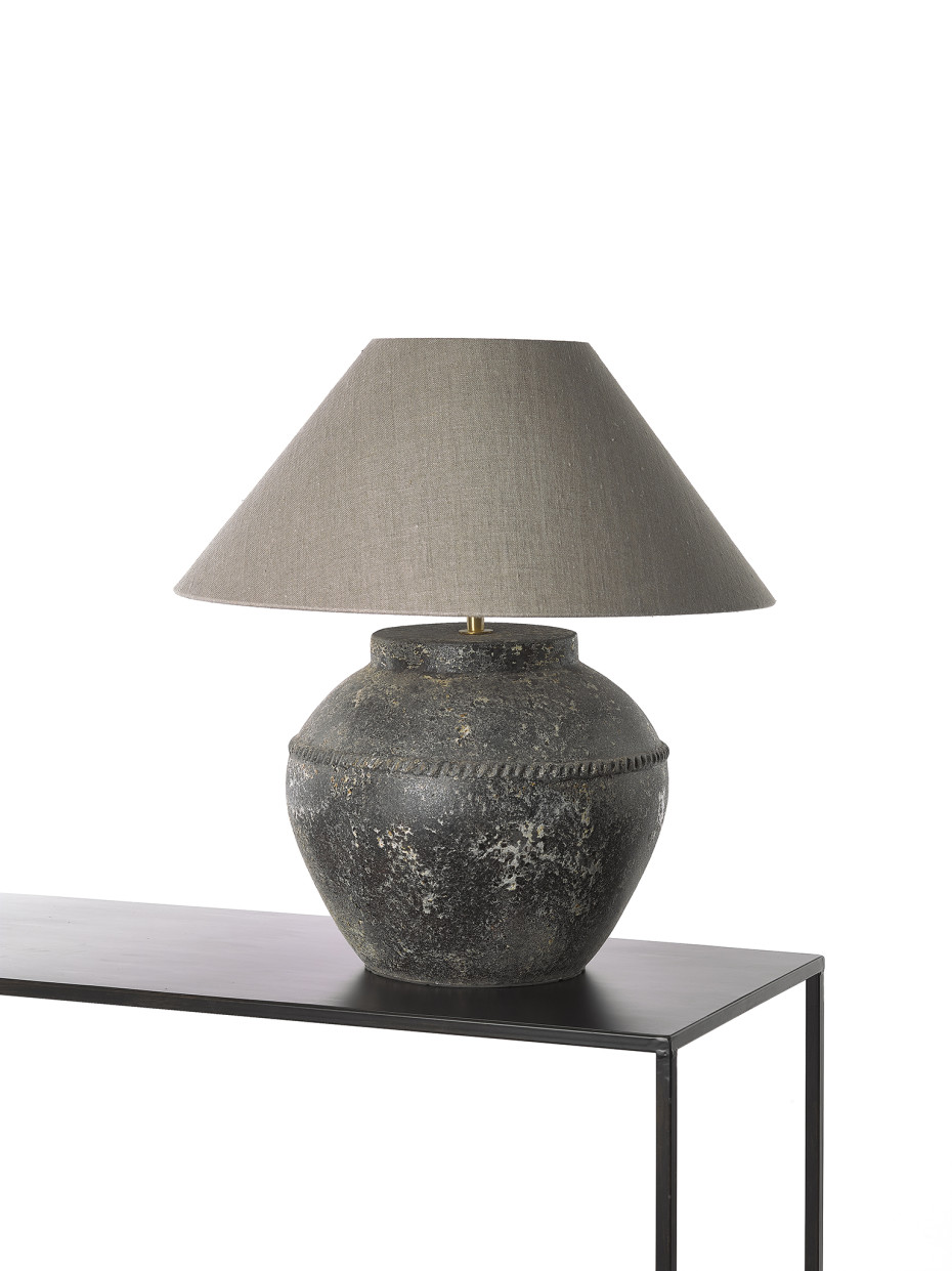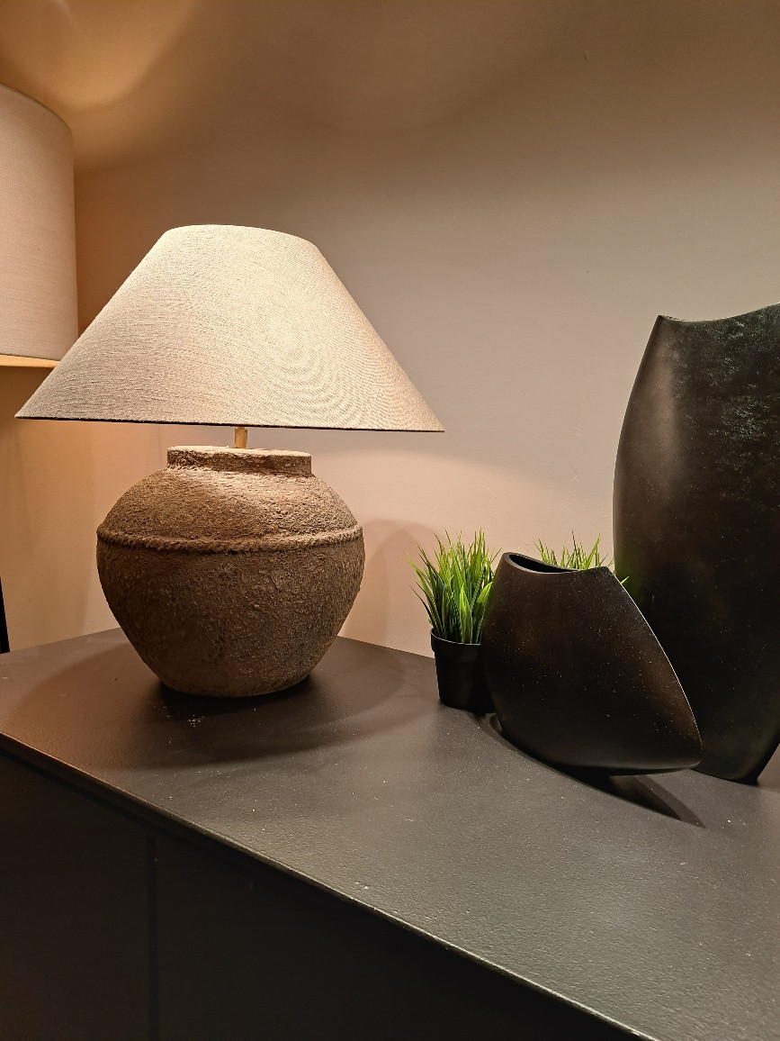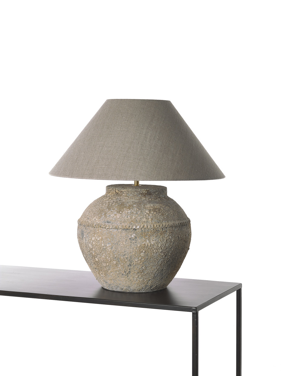 Stone lamp with round linen lampshade