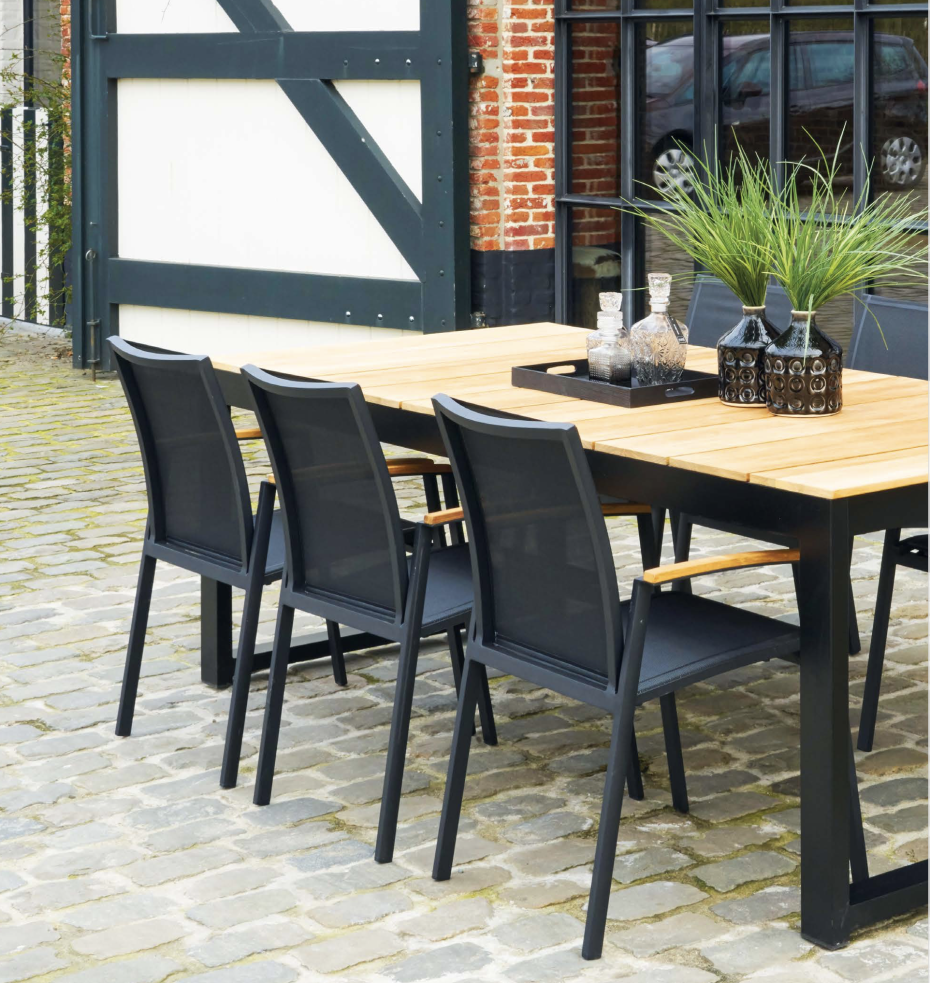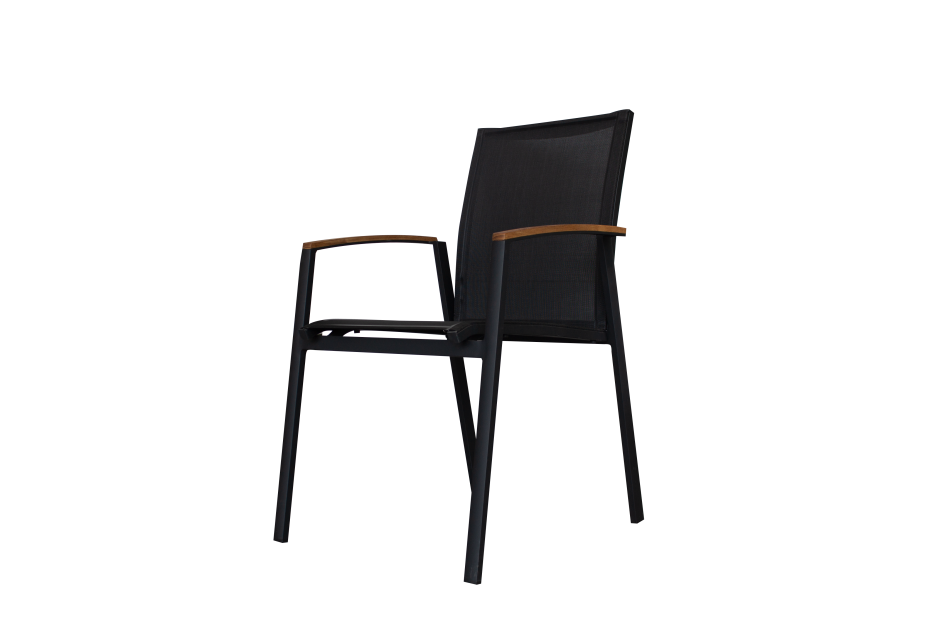 These Textilene garden chairs are modern armchairs with a beautiful teak armrest