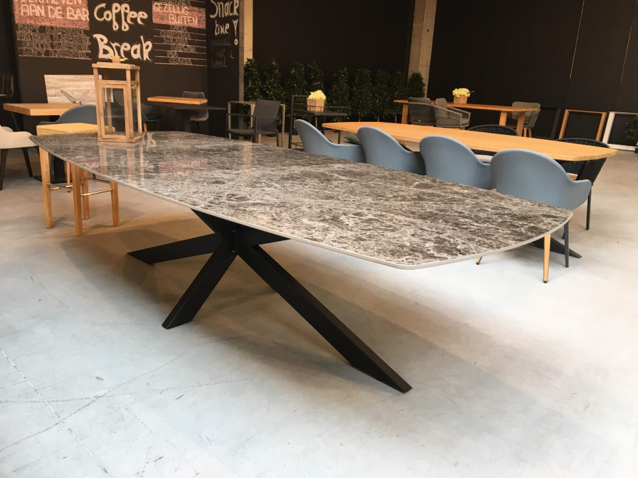 The Castle Line ceramic dining table marble look can be purchased in various length sizes L240 L260 L 280 or L300CM and you can choose with a black metal star leg or a white metal star base.