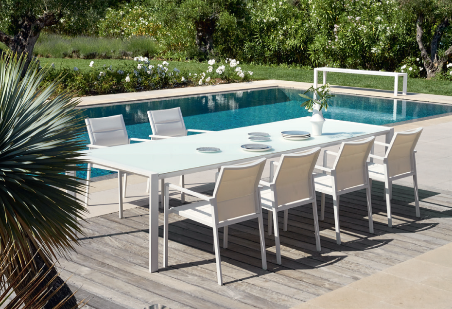 ALEXA garden chair from Diphano is made of aluminum with perforated textile, extra strong thanks to a double layer.