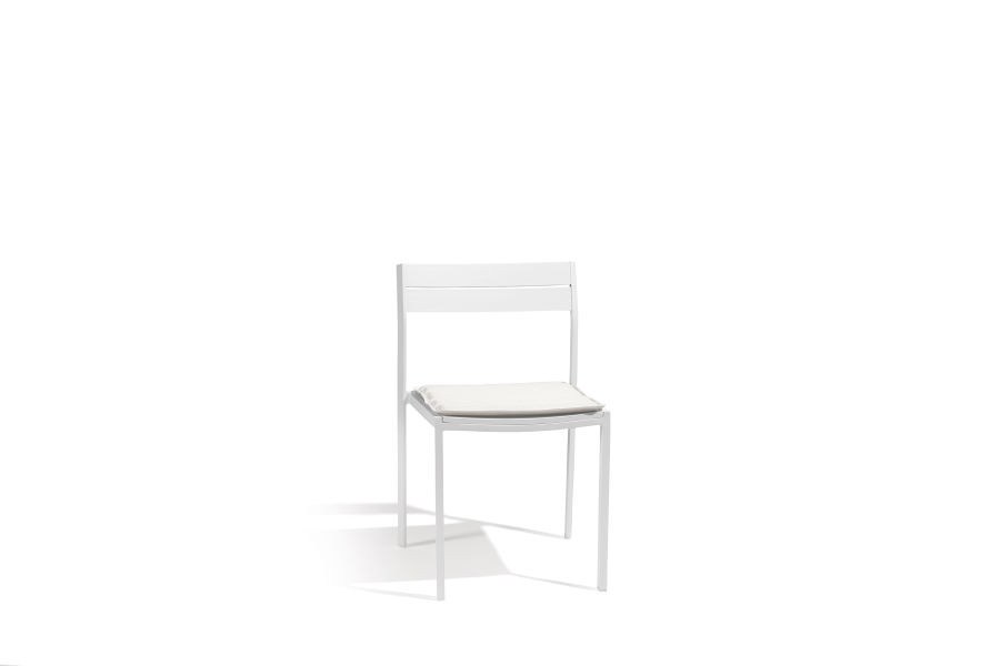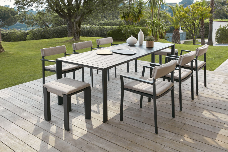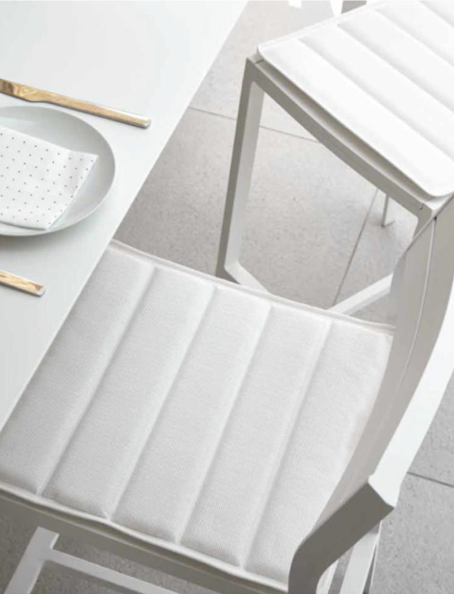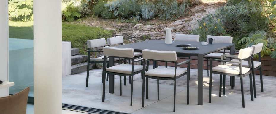 This Metris Outdoor living armchair can be upholstered with back and seat cushions for extra comfort for an additional charge. You can opt for single seat cushions (textylene) or thick back and seat cushions (subbrella fabric + foam) in 2 different colors: light gray or sunbrella. These Diphano Metris chairs are very chic at your garden table because of their low backrest.