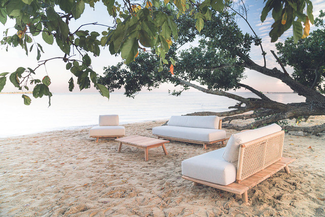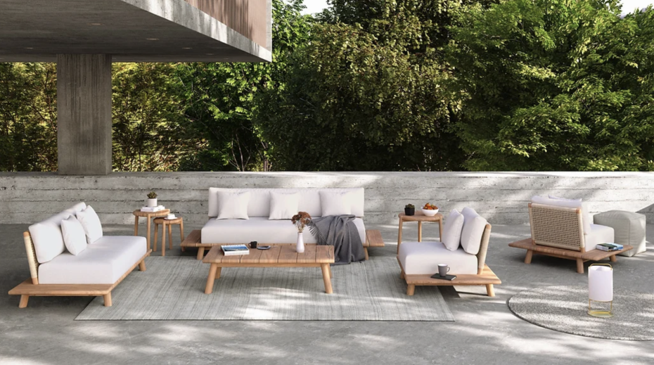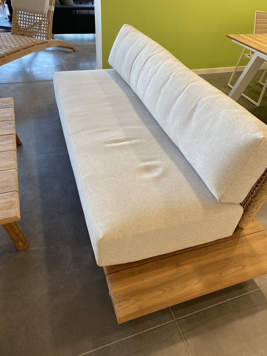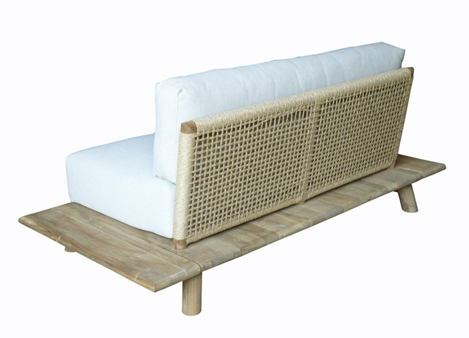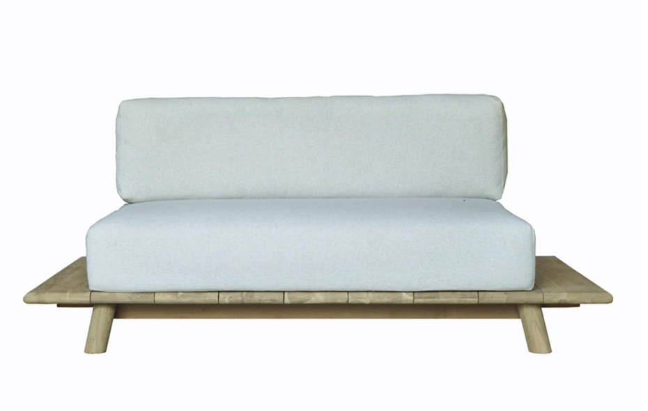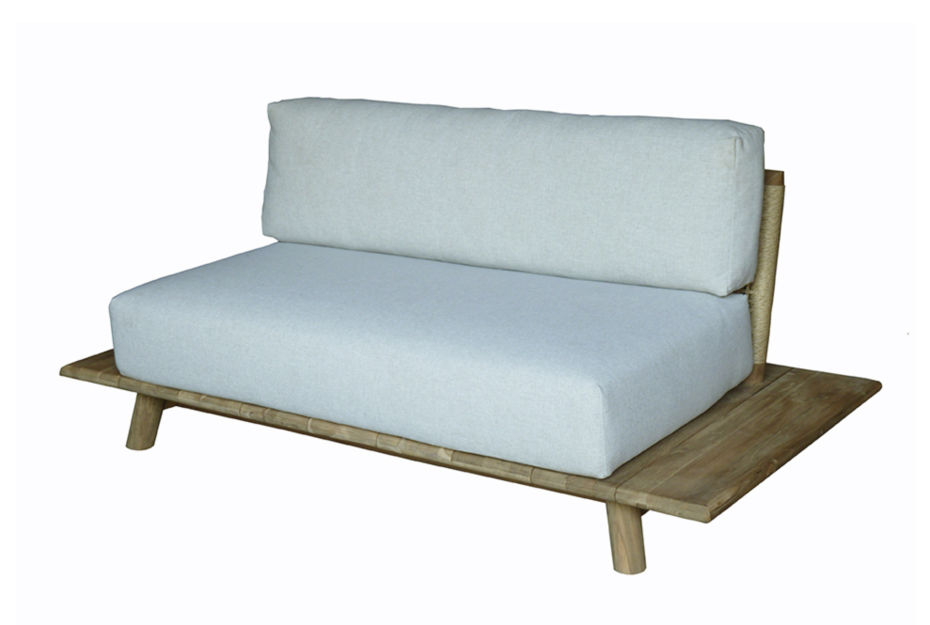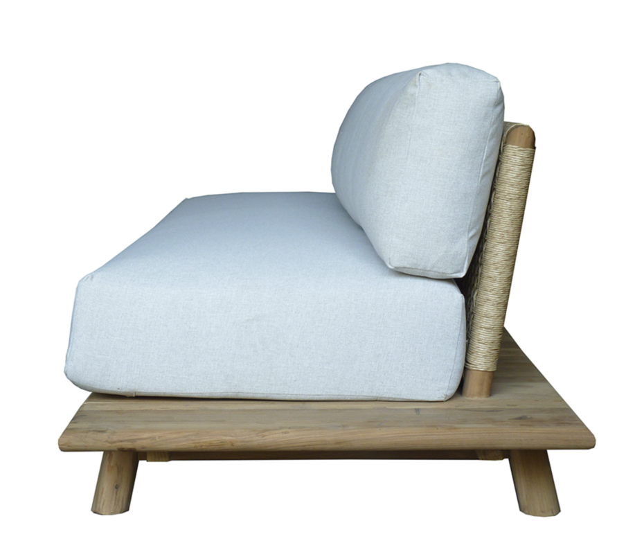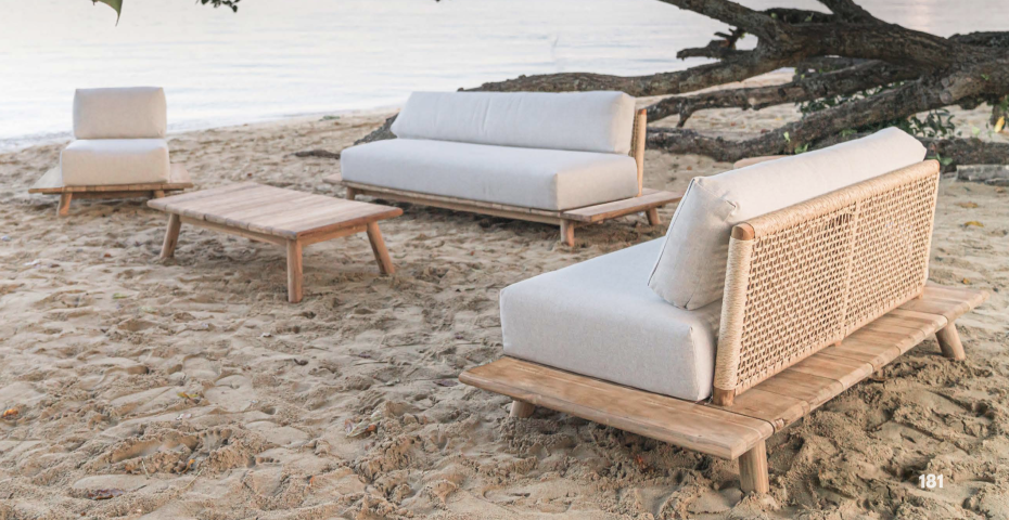 Sofa lounge garden furniture in Ibiza Style is finished in teak wood with very comfortable seat and back cushions.