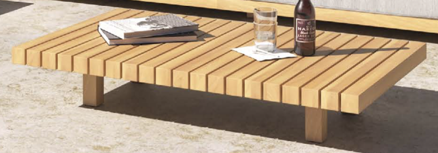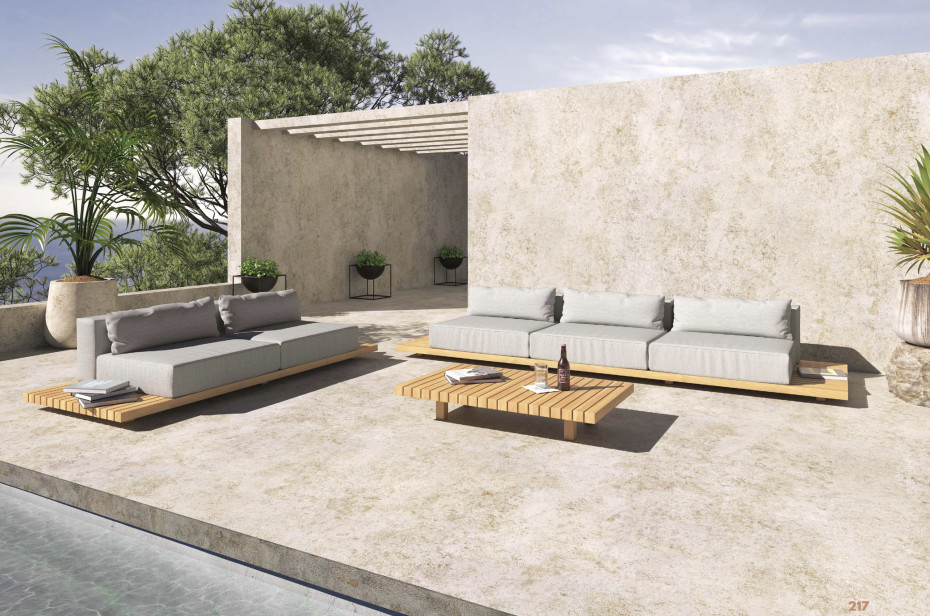 The outdoor lounge sofa is equipped with handy teak wooden side tables on the sides