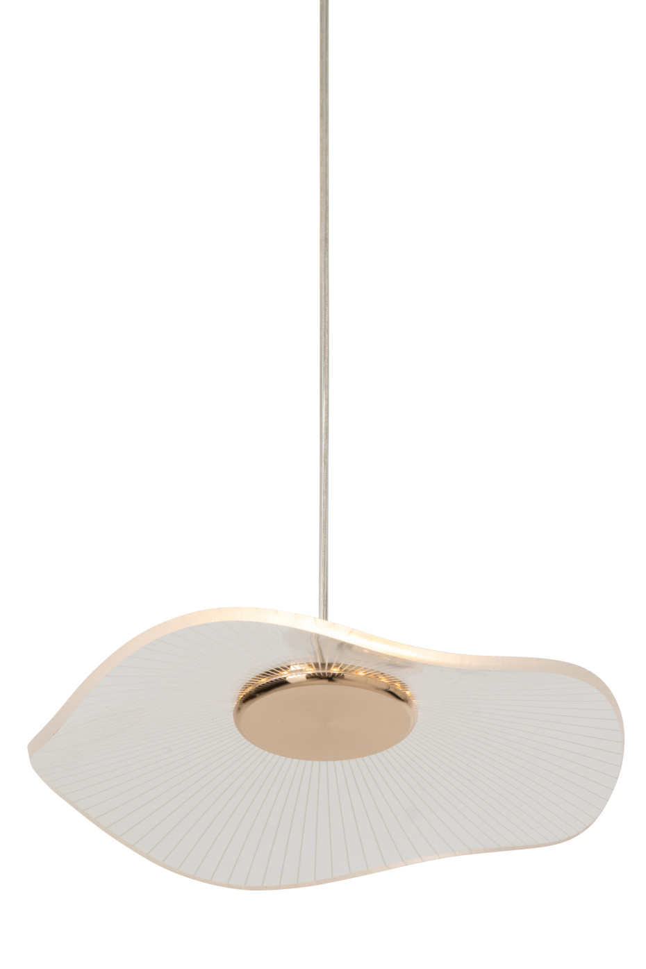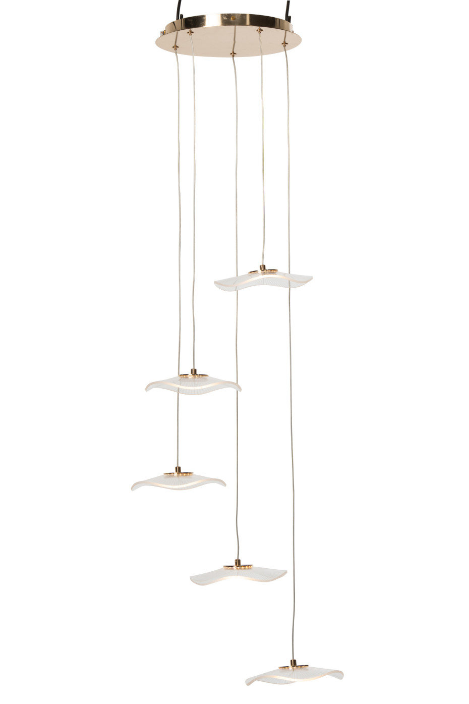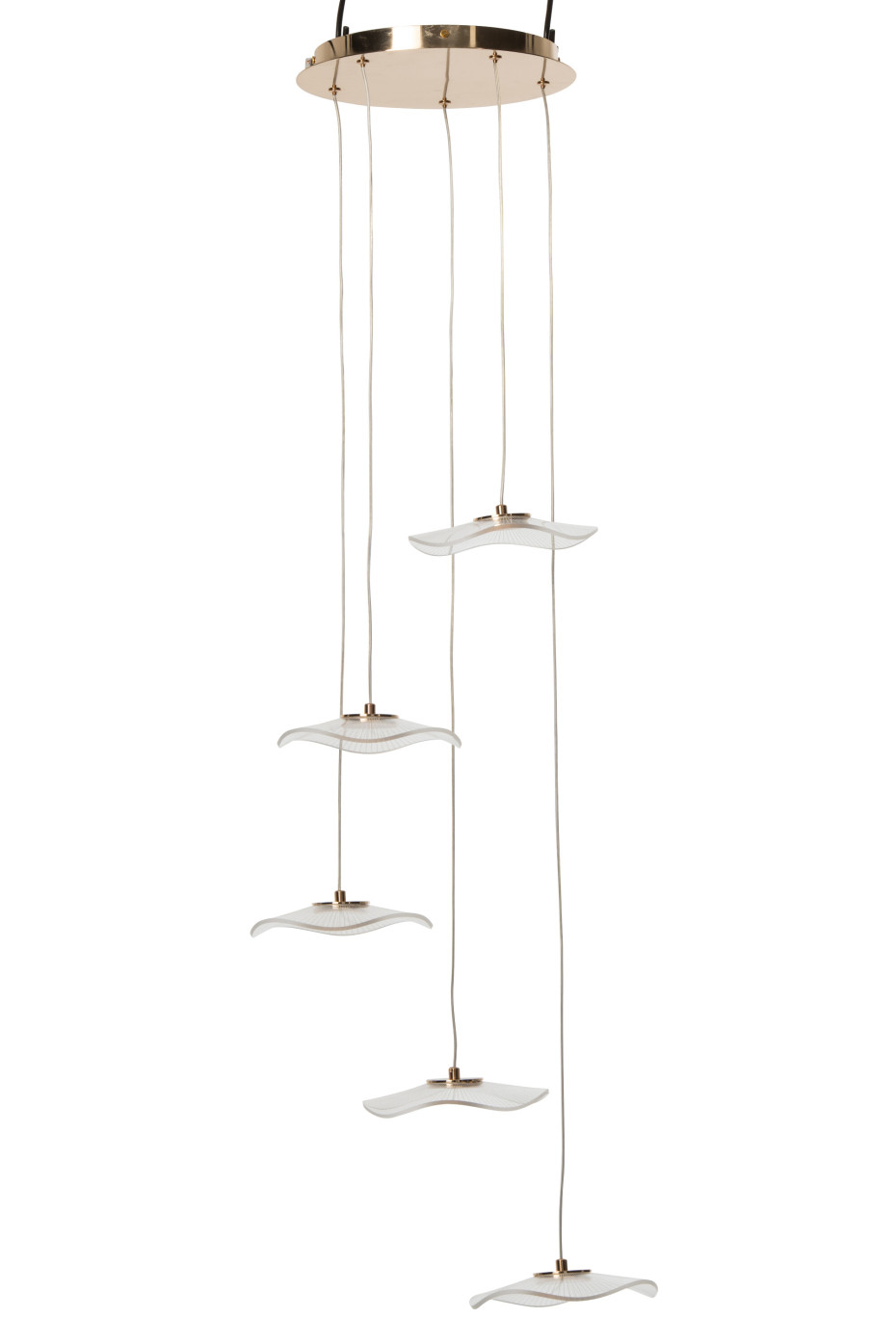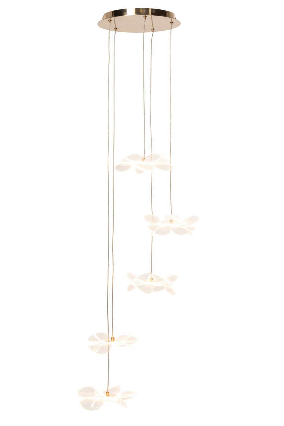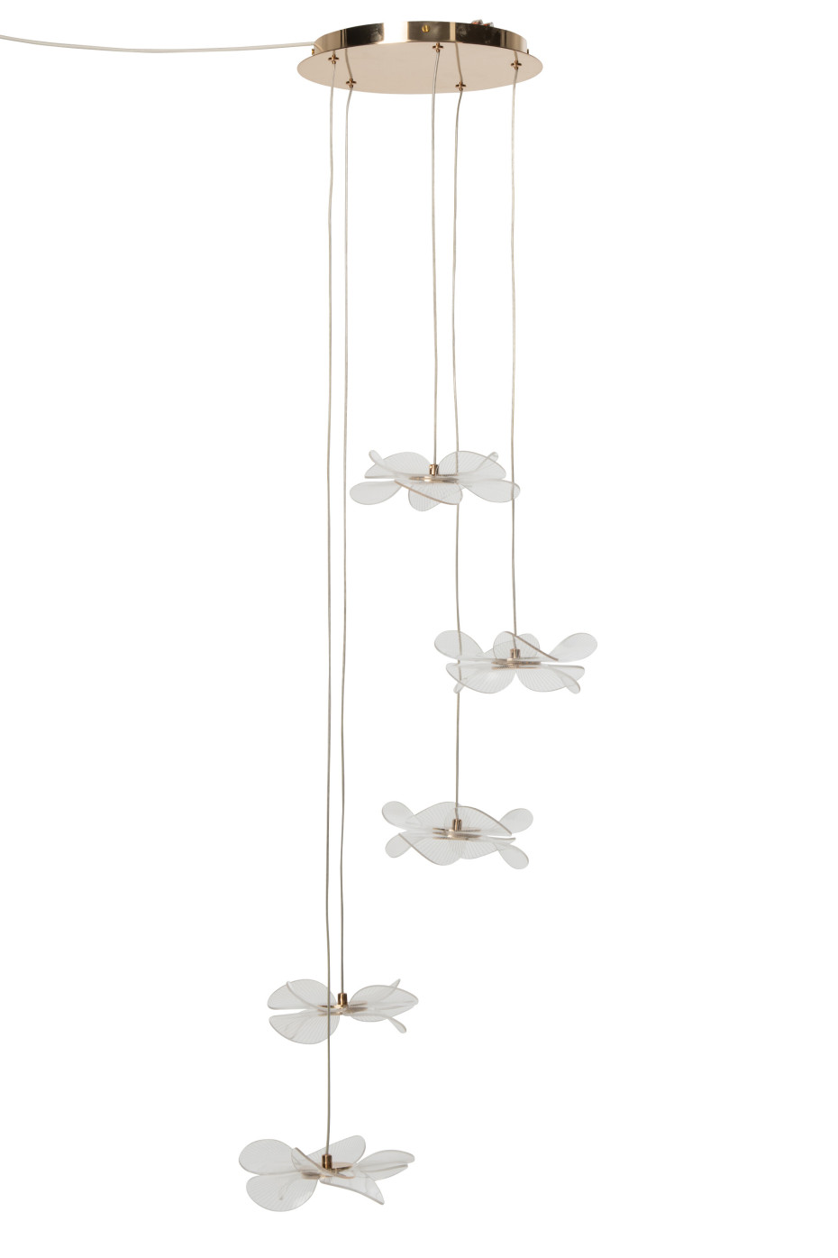 Lustre design en acrylique doré avec pendantes en forme de fleur, Dim 50 x 50 x 150 cm.