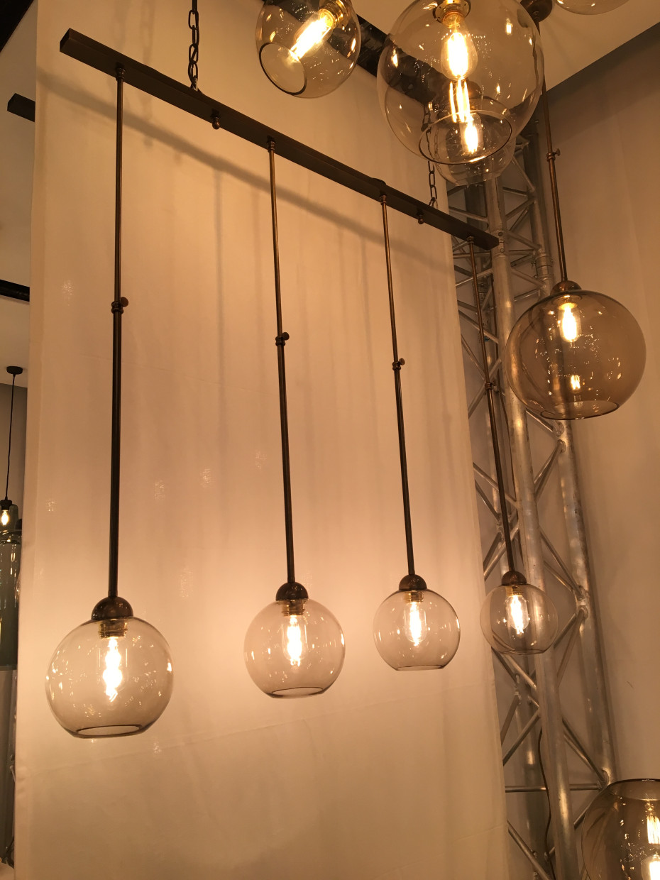 Deze loft hanglamp is mogelijk te bestellen met globe lampenkappen in helder transparant glas of topaz glas.