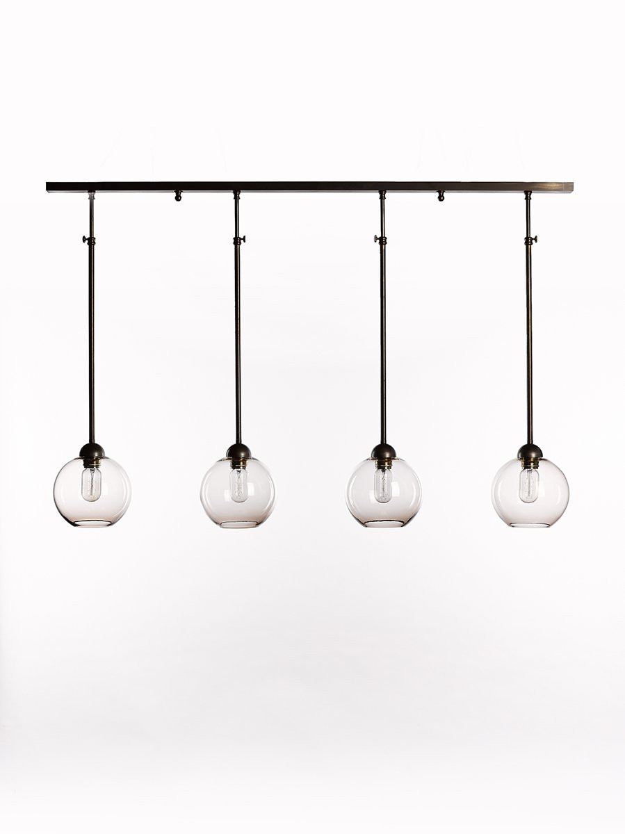 Ottone brons loft stijl hanglamp met 4 pendels en 4 glazen globe lampenkappen. Telescopische luster in ottone brons messing met globes lampenkappen. De bolvormige glazen lampenkappen zijn of topaz taupe of helder transparant (vermeld uw keuze op het einde bij uw bestelling). De 4 brons pendels zijn in hoogte verstelbaar: min65-max100cm