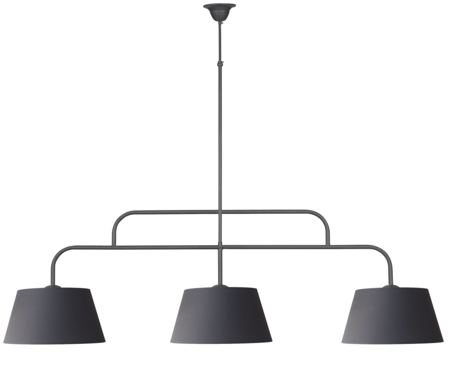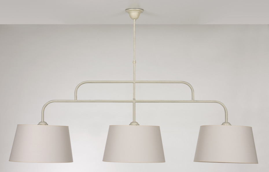 La lampe à 3 lampes a une taille totale de B 128,5 cm x max H 85 cm (réglable min H55cm), la taille entre 2 points de lumière est de 52 cm.