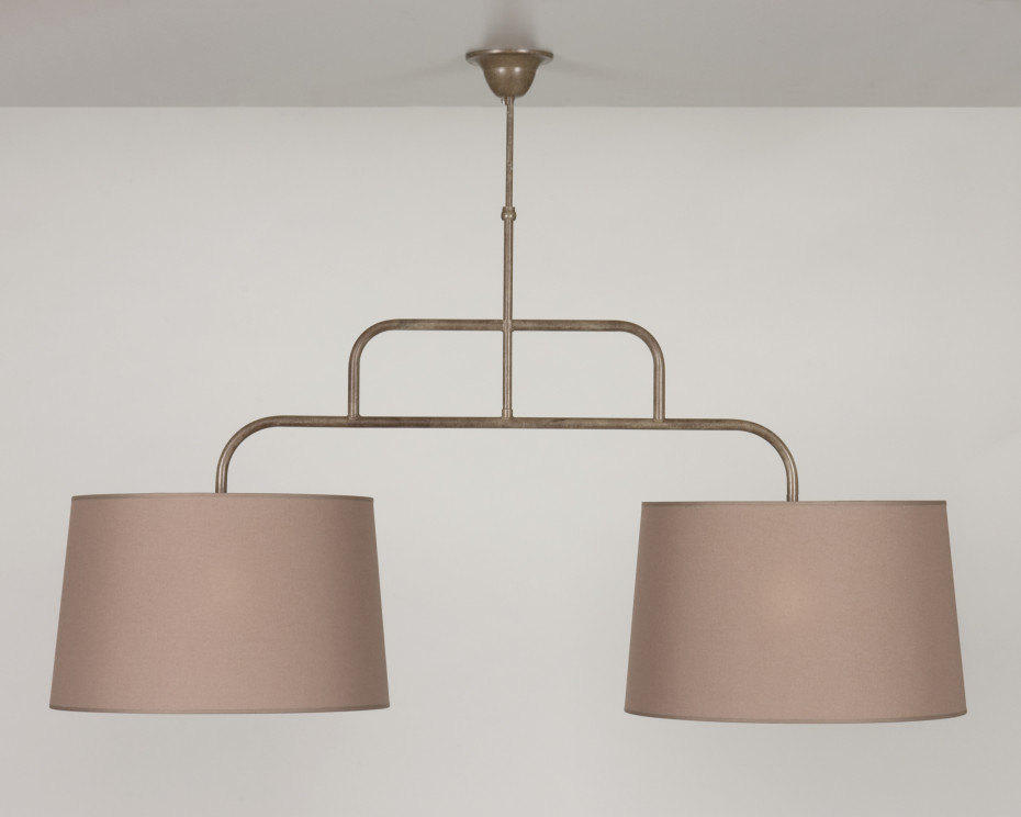 Le pendentif avec 2 lampes a une taille totale de B 77cm x max H 85cm (réglable min H55cm)