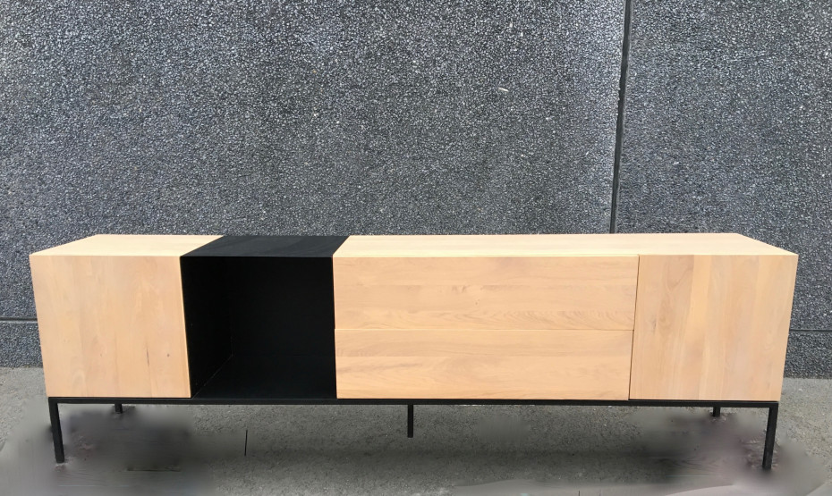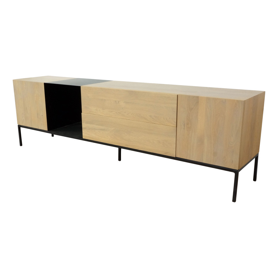 Contemporain buffet en placage de chêne de couleur naturelle avec base en métal noir et compartiment de rangement ouvert en métal noir.